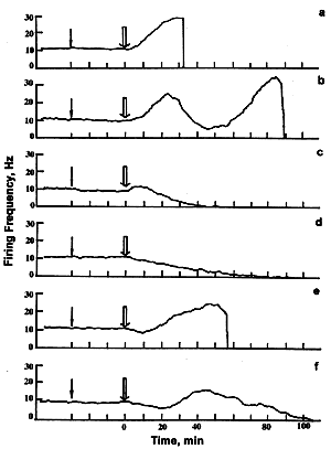 Fig. 2. The main types of neuron responses to photodynamic effect. A - E-response; B - EIE-response; C - EI-response; D - I-response; E - IE-response; F - IEI- response. Ordinate - firing frequency, Hz; abscissa - time, min. 3.3. Concentration dependencies In order to compare PD efficiencies of different PSs we studied dependencies of neuron lifetimes T on PS concentrations C. These were approximated by the power functions: T(C) = a*Cb linear in the double logarithmic coordinates: lg T= lg a + b*lg C (Fig. 3). Parameters a and b determined by the least squares method are presented in the Table 3. The most effective PS occupy the left lower corner in the Fig. 3. These data show that PD efficiency is increased in the following series: Photoheme 2,4diOHbu < Photosens <