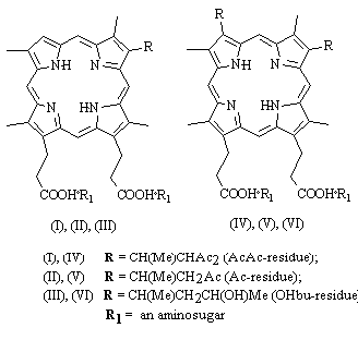 The chemical formulae of the studied DPs are shown in Fig. 1, and their main physical and chemical characteristics are presented in Table 1. Light absorption spectra of these PSs were recorded by spectrophotometer Hitachi 557 (Japan), using 0.01 M borate buffer solution (pH 9.18) as a solvent. Chromatografic mobility indexes Rf characterizing lipophilicity of methyl esters of these compounds were determined by thin layer chromatography on Kieselgel 60 F254 plates (Merck) using mixture chloroform-ethanol-acetone (99:1:10). Amphiphilicity of these PS was estimated on the basis of the partition coefficient (Kp) in the system 1-octanol/phosphate buffer (pH 7.4). Table 1. The main physical and chemical