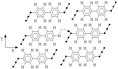 Fig.5 Reaction mechanism of polymer formation in solid state photolysis of aromatic azide. F igure 6 shows that the movement of azide molecule along its long axis (X direction) is more energetically preferable compared to the movement of the molecule along its short axis (Y direction) or the interlayer movement (in the directions being perpendicular to the X-Y plane).