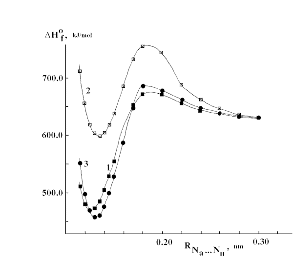 Fig.7 (a) Changes of net charge (compared to the isolated molecule) of N3 group of HN3 molecule during the movement of NH towards the nitreneous nitrogen of N3 group in HN3 molecule; (b) formation enthalpies of {HN3 +HN}T system as a function of interatomic distance between nitrogen of NH molecule and nitreneous nitrogen of HN3 molecule.Acknowledgment. We thank the Interdepartmental Scientifical and Technical Program "Chemistry" ("Photochemistry" division) (Russian Gov.Com.) for financial support of the research. References .1. Horner L., Christmann A., Gross A.//Chem.Ber.1963.Bd.96.S.388. 2. Lwowski W., Scheiffell E.//J.Am.Chem.Soc.1965.V.87.P.4359. 3. Reiser A., Leyshon L.J.// J.Am.Chem.Soc.1971.V.93.No.16.P.4051. 4. B?ssler H., Schultz R.C.//Makromol.Chem.1972.Bd.158.S.113. 5. Zelentsov S.V., Oleinik A.V., Karjakina L.N.// 4th Conf. Non-silver and unusial photographic processes". Abstr.Book Vol.2. Tchernogolovka.1984.P.43 (in Russ.) 6. Oleinik A.V., Zelentsov S.V. // Proc. of Nizhnii Novgorod Univ. 1994. P.189. (in Russ.) 7. Moreau W.M. Microdevices. Physics and Fabrication Technologies. Plenum Press. New York. 1988. 8. Meijer E.W., Nijhuis S., van Vroonhoven F.C.B.M.//J.Am.Chem.Soc. 1988. V.110.No.21.P.7209. 9. Cox R., Clecak N., Moreau W.M.//Polym.Eng.Sci.1974.V.14.P.491. 10. Yabe A., Niino H., Moriyama H., Ouchi A.//Chem.Funct.Dyes: 1st Int. Symp.Tolego.1989.P.206. 11. Yabe A., Ouchi A., Moriyama H., Masuda E.// US Pat. No.4875986. Cl.204/157.6. Publ.24.10.89. 12. Kobayashi T., Miura A., Ohtani O., Yamaoka T.//Conf. Laser and Electro-Opt., OSA/IEEE Div.Techn.Pap.Washington.1986.P.36 13. Harada Y., Takahashi T., Mutai K. //J.Chem.Phys.1981.V.75.No.4. P.2014. 14. Zelentsov S.V., Oleinik A.V., Karjakina L.N.//High Energy Chemistry. 1986.V.20.No.4.P.339. 15. Karjakina L.N., Zidkova E.M., Janin A.M., Oleinik A.V.//High Energy Chemistry. 1987.V.21.No.4.P.348. 16. Zelentsov S.V., Oleinik A.V. //Conf. Radical Polymerization. Gorkii. Abstr.Book.1989.P.238. (in Russ.) 17. Zelentsov S.V., Kokorev V.N., Oleinik A.V. // 4th Conf. on Carbene Chemistry. Moscow.Nauka.1987.P.52. (in Russ.) 18. Kokorev V.N., Zelentsov S.V., Oleinik A.V. // 5th Conf. on Carbene Chemistry. Moscow.Nauka.1992.P.162. (in Russ.) 19. Laboratory Handbook of Chromatographic and Applied Methods/ Ed. by O.Mikes.Ellis Horwood Ltd. Publishers.New York e.a. 1979. 20. Zefirov U.V., Zorkii P.M. // J. Struct.Chem. (Russia).1974.V.15.No.1. P.118. 21. Kononenko L., Urre T.A., Dmitrieva V.N., Efros L.C., Bezhuglii V.D. // J. Gen.Chem. (Russia) 1970.V.40.No.6.P.1359. 22. Smith A.L. Applied Infrared Spectroscopy. Fundermentals, Technics, and Analitical Problem-Solving. John Wiley and Sons Publ. New York e.a. 1979. 23. Dyer J.R. Applications of Absorption Spectroscopy of Organic Compounds. Prentice-Hall Inc. New-York e.a. |