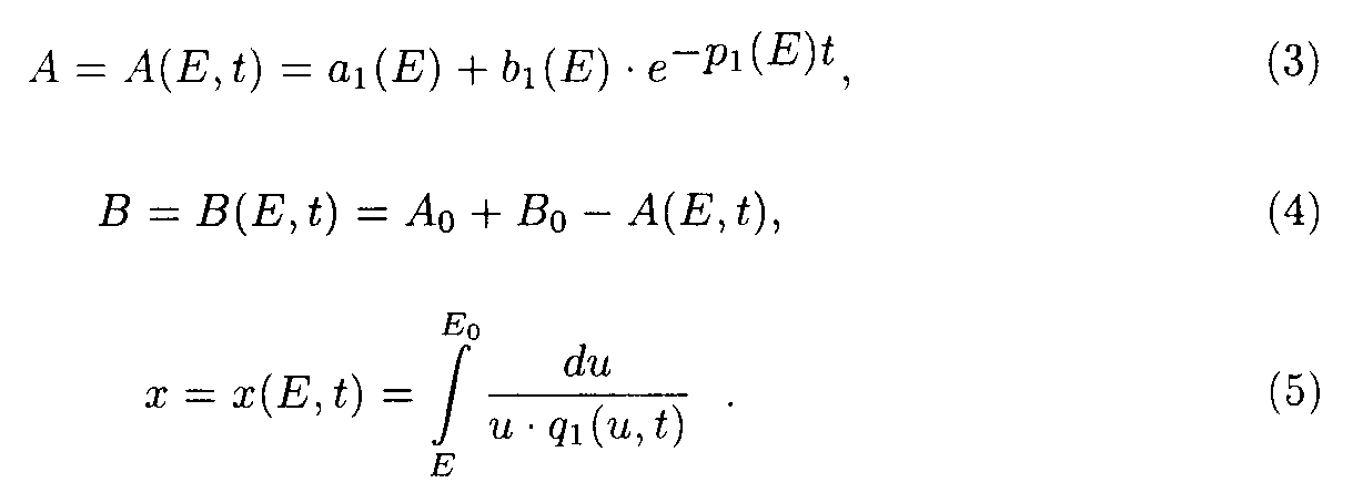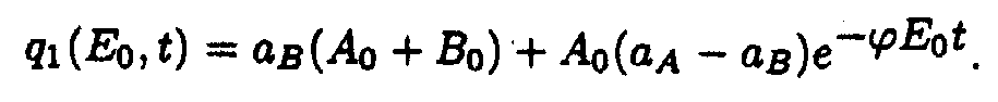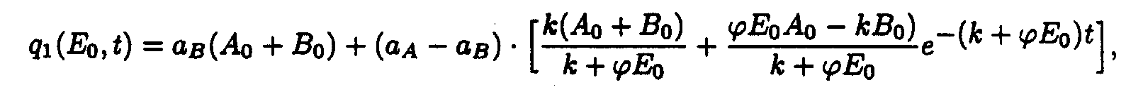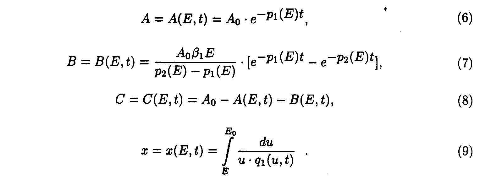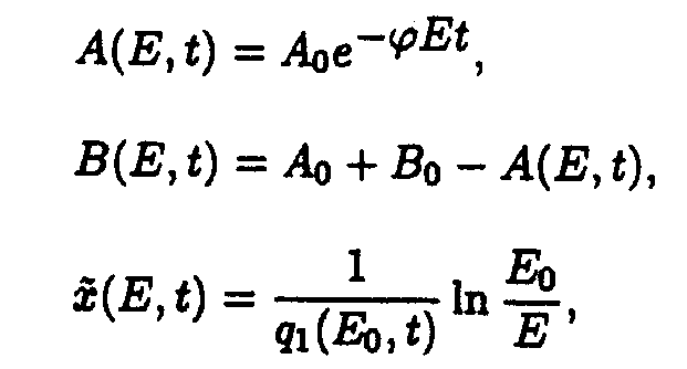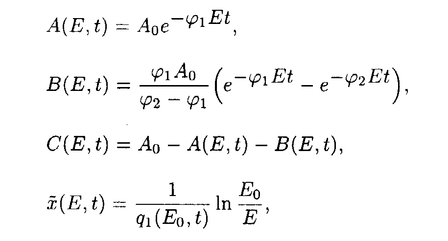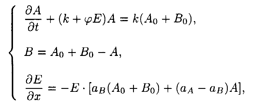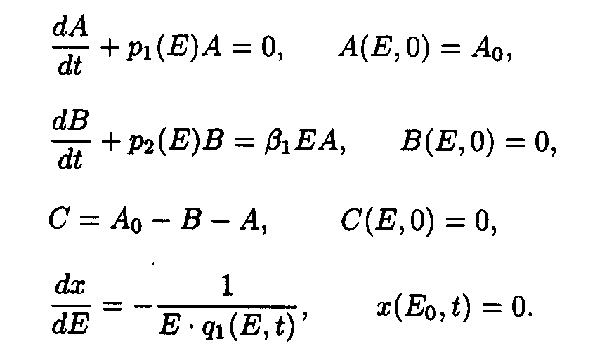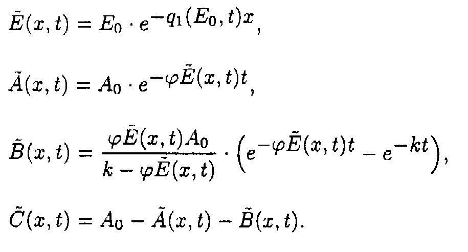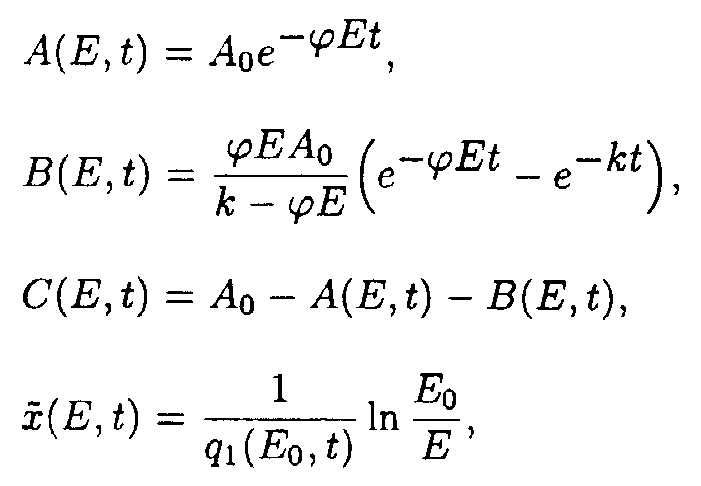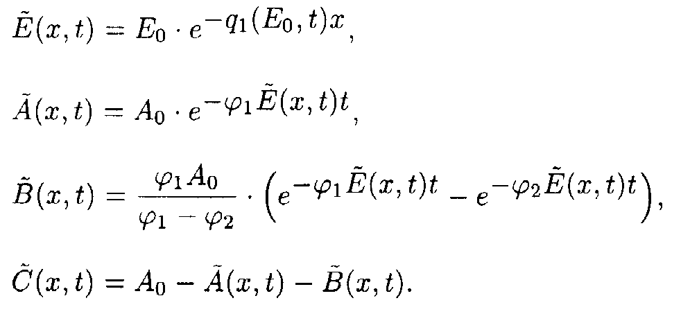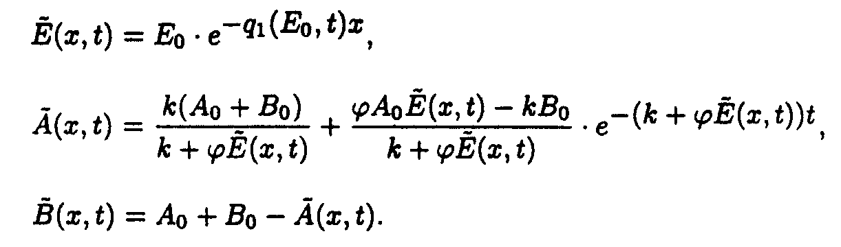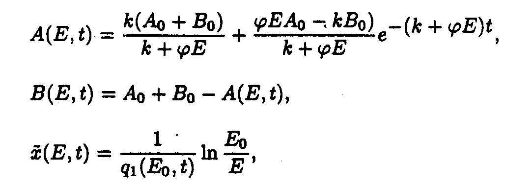 Here p1(E)=a 2+ a 3E, q1(E,t)=e 1+ e 2A(E,t). Exact solutions for the set of ODE may be written as following: Here a1(E) = a 1/p1(E); b1(E) = Ao- a1(E). Exact solution such as eq.(5) contains special functions therefore the procedure of deriving approximate solutions desires to be given to do a practical use more convenient. Taking into account only the first term of Taylor's expansion of q1(E,t). one may obtain It is easy to show [5] that if then where 4. Solution of the system describing the model 2. As in the case of the first system one may take u.v. irradiation intensity and current time as independent variables. Then the initial system (2) splits into the set of ODE with separated boundary conditions imposed. Here we adopted the following designations: Exact solutions for the set of ODE may be written as following: