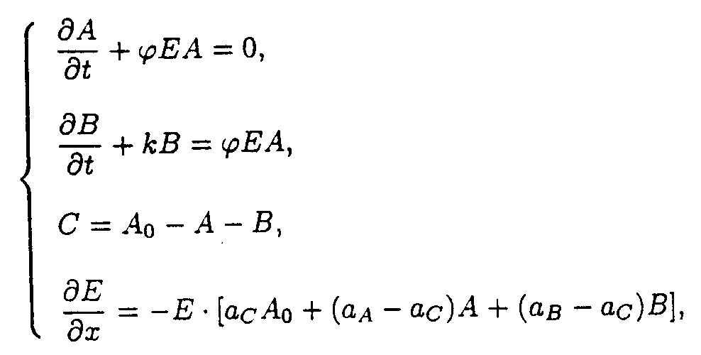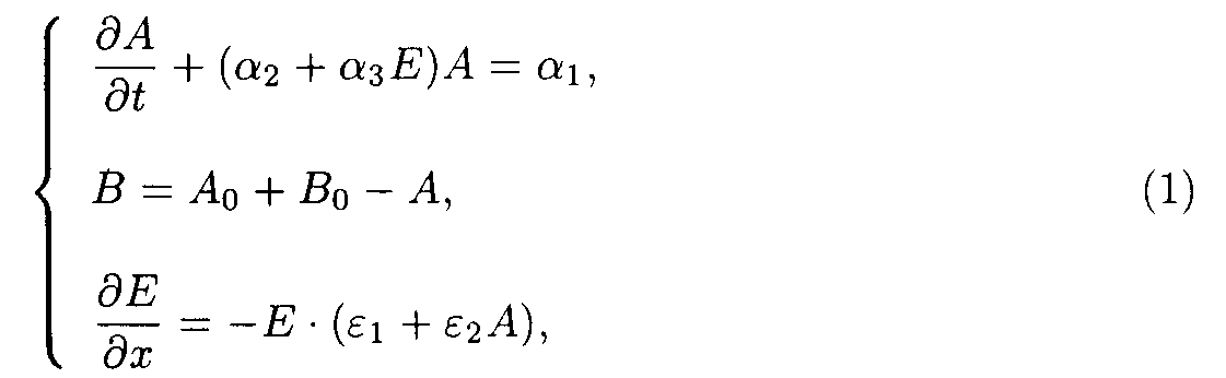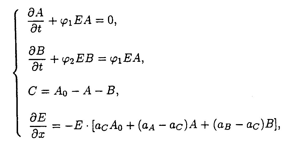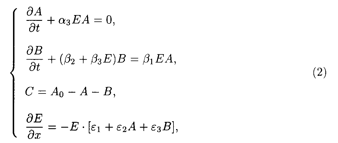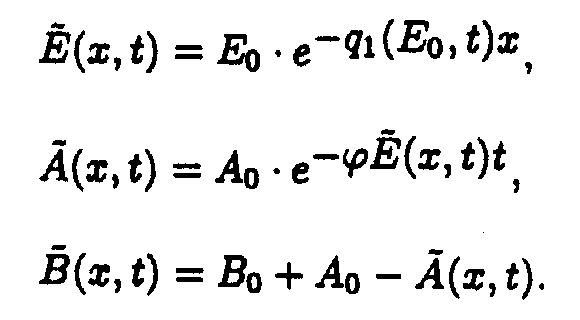 3. Solution of the system describing of the model 1. So as ¶ E/¶ x ¹ 0 for all x ³ 0, and t ³ 0, one may take u.v. irradiation intensity and current time as independent variables. Then the initial system (1) splits into the set of ordinary differential equations (ODE) with separated boundary conditions imposed.