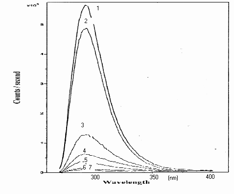 In the fluorescence spectrums of samples obtained by using Solar Concentrator System, disappearance of phenol also has been seen shorter time than other systems as following in respectively; ( 1 ) Standard phenol solution, ( 2 ) No irradiation in the presence of photosensitiser, ( 3 ) 3 min. irradiation, ( 4 ) 6 min. irradiation ( 5 ) 9 min. irradiation, ( 6 ) 12 min. irradiation, ( 7 ) 15 min. Fluorescence spectra on degradation of phenol with ZnO are shown in Figure 2 below.