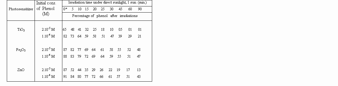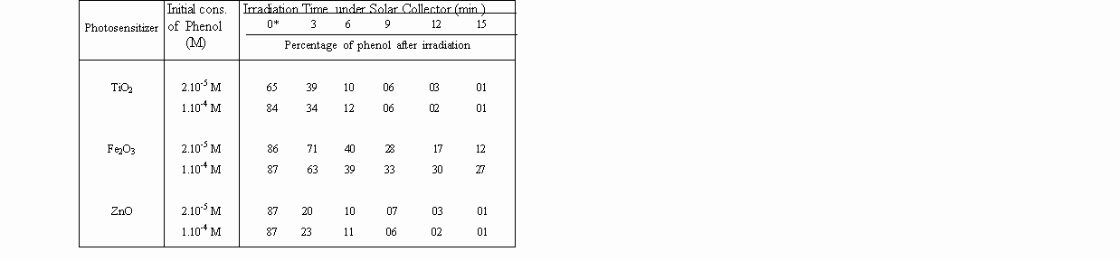 Solar photodegradaton of phenol by metal oxides (TiO2, Fe2O3 and ZnO ) under concentrated sunlight is not reported in literature. We now presents the results of photodegradation of phenol rates under direct and concentrated sunlight.