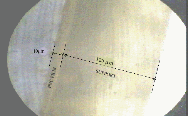 The optode polymer films were prepared from a mixture of 120 mg of PVC, 240 mg of plasticizer, equimolar PTCPB to dye DPO and 1,5 ml of THF (dry). The concentration of DPO in mixture was in the range of 10-3 - 10-4 M (about 20 mmole dye/kg polymer). Fluorescence emission of DPO was lost at lower than 10-4 M concentrations, in plasticisized PVC. The resulting cocktails were spread onto a 125 m m polyester support (Mylar type) , by means of a spreading device (from Heidelberg- Germany). PVC films were kept in a THF containing dessicator and in the dark for the photostability of the membrane and the damage from the ambient air of laboratory was avoided. Each sensor PVC film was cut with a width of 120 mm and located diagonally into the sample cuvette. The advantage of this kind of a placement was to improve the reproducibility of the measurements. The films were photographed under Leitz ortopcan polarise microscope, connected to a computer and thicknesses were measured in reference to thickness of Mylar type polyester support. Figure 1 shows the picture of film contain DPO in plasticisized PVC matrix, where polyester support and plasticisized PVC film is visible. PVC films were measured to be in the range of 5-10 m m.