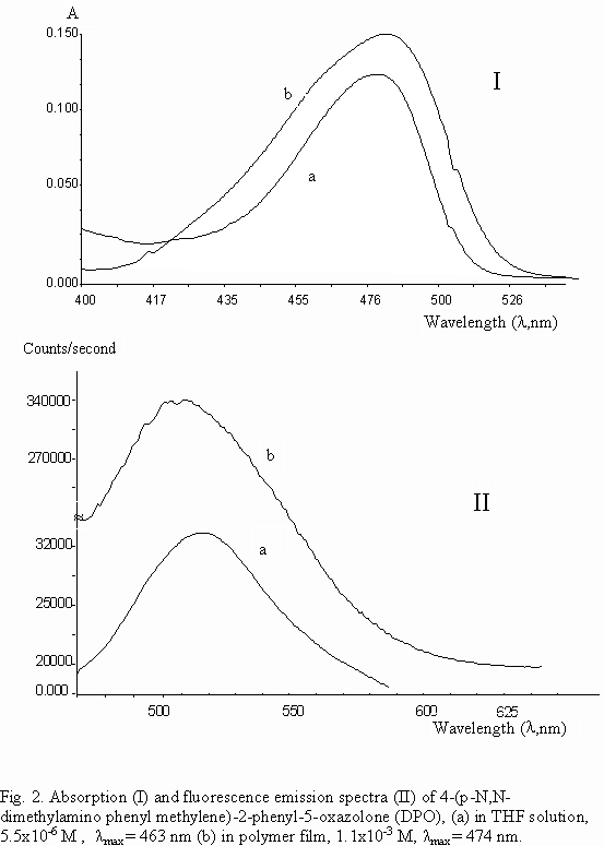Under the light of literature, one would study the fluorescence emission of azlactone molecule in an immobilized phase, where higher yield of fluorescence emission and improved stability toward chemical and photochemical environment could be reached. Our earlier studies revealed that 4-(p-N,N-dimethylbenzal)-2-phenyl-2-oxazolone, DPO, gives better fluorescence quantum yields, Qf, in solution and in solid state in comparison to other benzal oxazolones. In fact in solid state Qf is about unity. The colour of DPO is bright red in crystal form, in contrast to pale yellow-orange colours of other azlactone crystals. Long wavelength absorption of DPO (465 nm) in liquid phase, may display a colour change in polymer film if protonated in an acidic medium, which may be used as a practical visual observation.