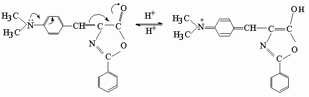 4-(p-N,N-dimethylbenzal)-2-phenyl-2-oxazolone, DPO, was selected among the oxazolone derivatives, because of its longest wavelength absorption (l max= 465 nm) in visible region, and highest fluorescence quantum yield (Qf @ 0.003, Table 1) compared to all of the azlactones studied earlier[ 5] . Also it is observed that the dye DPO has an excellent solubility in plasticized PVC matrix. High molar extinction coefficient (e = 2-5x104 M-1cm-1 in liquid phase) of DPO is another parameter of advantage of selection in polymer film matrices[ 6] . UV absorptions of DPO were recorded in acetone and dimethylformamide solutions, and l max @ 465 nm absorption was found to be unchanged on titration with perchloric acid dissolved in glacial acetic acid. But when DPO solution was titrated with tetrabutylammoniumhydroxide solution in 2-propanol, it was found that l max @ 465 nm absorption disappeared and an intense band appeared at l max @ 360 nm, and a colour change from orange to yellow occurred. Acidification with glacial acetic acid, did not changed the colour either. In general it appears that non-aqueous solutions of DPO is in part stable in acidic medium, but unstable in basic medium. This result may indicate that DPO is protonated in acidic medium as shown in the scheme below. Probably resonance contribution from methylated aniline ring contributes to the formation of enol form in hetero ring.