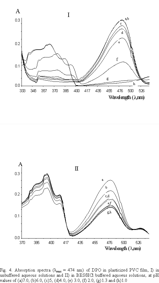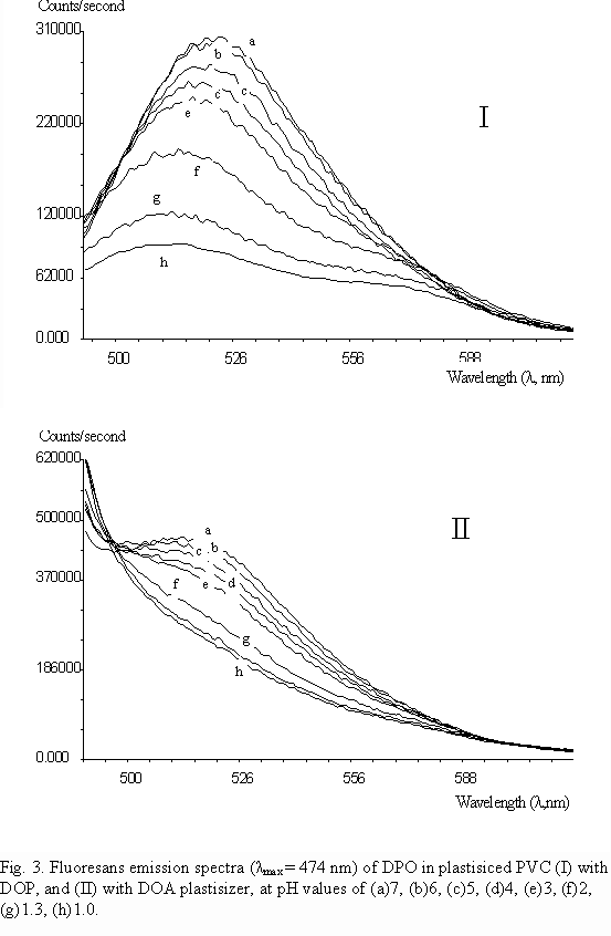 Figure 3 shows the resolution differences of DPO fluorescence emission in DOP (PF-1) and in DOA(PF-2) plastisizers, in PVC polymer film matrices. As seen fluorescence emission resolution is lost in DPO/DOA(PF-2) composition, from neutral to acidic solutions.