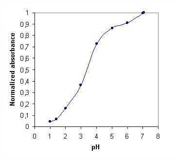 pKa value of DPO were calculated in polymer film matrices. UV absorption of DPO were recorded in buffered, BES/HCl solutions, and in unbuffered, HCl solutions, (Fig. 4). The buffer capacity of the sample matrix is seen to influence the sensor response strongly. Normalized absorption parameters(Ax/Ao) are calculated by division of measured absorption to absorption at neutral pH as Ao (pH @ 7). Figure 5 shows the plot of normalized absorbance, Ax/Ao versus to measured pH values in buffered solutions. pKa value was found as pKa = 3.4, pH value at half of the normalized absorption. pKa was also calculated by using non-linear fitting algorithm of Gauss-Newton-Marquardt method [ 14] .