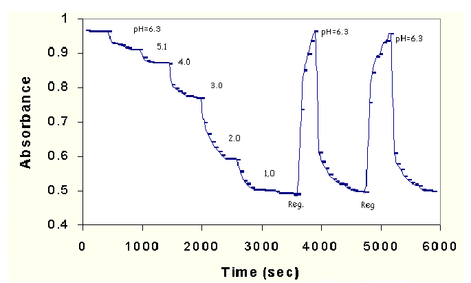 DPO in composition of PF-1 polymer matrix was found to give re-producible results on fluorescence emission measurements when pH was varied from 7 to 1 and from 1 to 7. Dynamic pH range of 7 to 1 corresponds to HCl concentrations of 10-8 M to 10-1 M, respectively. The detection limit was observed to be 10-9 M HCl concentration. It was also observed that the colour of the polymer film was orange at pH 7, but gradually changed to pink as it reached to pH 1, and reverse colour change was observed opposite pH change. Proton binding was seen to be faster than that of unbinding. The regenaration time of DPO pH sensor was found to be 30 minutes in H2PO4-/HPO42- buffer solution, that gives a pH of 7 ± 0.02.