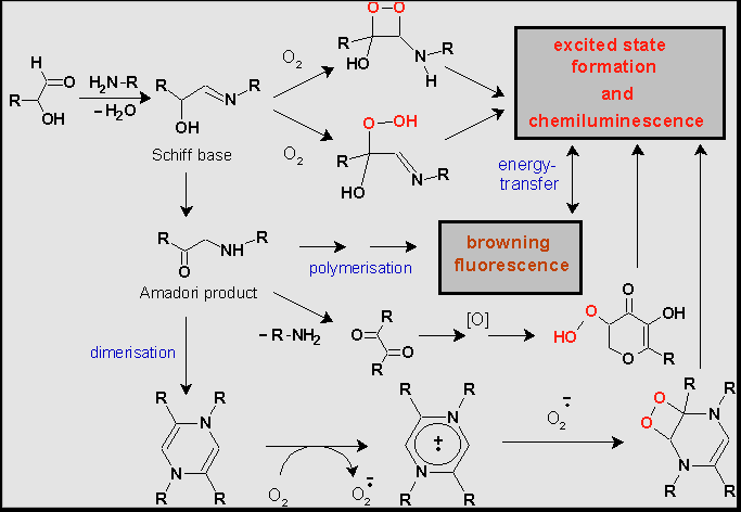 MR was initially the subject of food chemistry studies, because it accompanies thermal processing of food, the processes of wine and bear ripening and affects meals and drinks taste, aroma, and colour. Recently MR began to attract growing interest as playing an important role in ageing and pathogenesis of different diseases correlated to hyperglycaemia . Of particular interest is the ability of the products of MR starting with the Schiff bases to reduce molecular oxygen to superoxide anion radical (О2¾ · ) and other reactive oxygen species (ROS) . It was also shown that if MR is performed at high temperatures it is accompanied by weak CL . To explain the appearance of CL some potential pathways to electronically exited species have been proposed (Scheme 1). , .