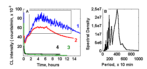 As a rule, oscillations of photon emission start at the stage of CL rise and disappear at some point after the maximal CL intensity has been reached. Dependent on the experimental conditions CL oscillations lasted from several hours to 2-3 days. The amplitude of oscillations reached sometimes values of 20 % of the average values of CL intensity. Fourier analysis (figure 1,B) revealed that dominating periods of oscillations are in the range of 15 – 40 min, while shorter periods have much lower spectral density.