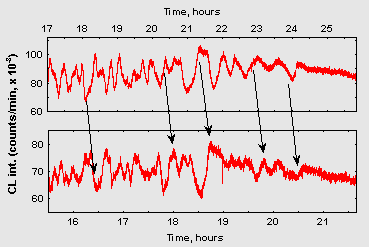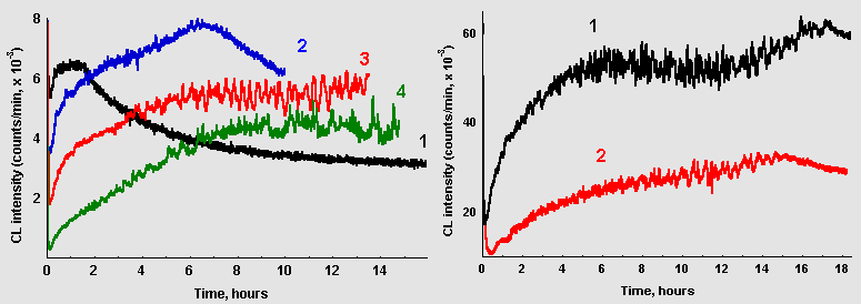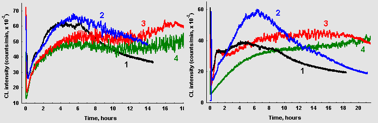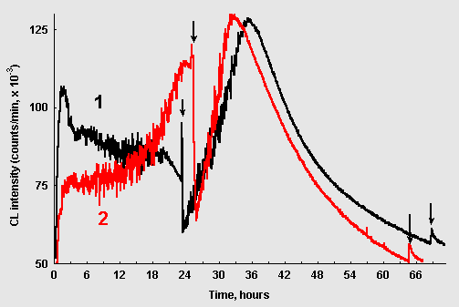 Noteworthy is also a surprising similarity of oscillatory patterns in the repeated experiments if the conditions of sample preparation were kept as similar as possible. Fig. 2 demonstrates fragments of CL dynamics in two such samples prepared in different days. Dissimilar time scales on these plots reflect that alike oscillatory patterns were developing in the two samples with different overall rates, probably because of some differences in the ambient temperature on these two days.