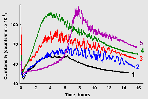 CL was determined in liquid scintillation counters Mark-II (Nuclear-Chicago, USA) equipped with photomultipliers EMI 9750QB/1 (GB) (photocathode S-11; wavelength region 300-600 nm) in the single photon rate counting mode. Reaction mixtures in volumes from 2 to 20 ml were poured in standard 20-ml borosilicate glass vials for LSC or in glass test-tubes, installed in the same vial. The vials were held stationary in a counting chamber. CL was registered at room temperature with high temporal resolution (0,1 or 0,2 min) for prolonged periods of time. Fourier analysis was performed by means of the program package Statistica 5.0.