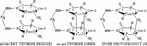 In agreement with the current laboratory model, it has been well- documented that DNA in spores exposed either directly to solar radiation, or in the laboratory to UV wavelengths present in sunlight, accumulate mainly "spore photoproduct" (SP; the thymine dimer 5-thyminyl-5,6-dihydrothymine) as the major UV photoproduct (Tyrrell, 1978) (Fig. 2).