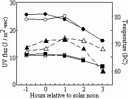 Fig. 3. Solar dosimetry performed on 21 July, 1999 (open symbols) and 22 July, 1999 (solid symbols). Temperature (triangles), UV-A flux (circles) and UV-B flux (squares) were recorded.