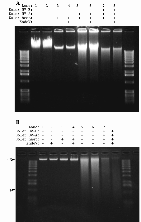 Fig. 4. Chromosomal DNA extracted from spores of strain WN356 exposed to UV-A sunlight on 5-16 October 1998 and full spectrum sunlight on 4-5 of August 1998 was electrophoresed through a neutral 0.8% agarose gel (A) or a 0.8% alkaline-agarose gel (B). Spores are: not exposed (lanes 1 and 2); exposed in parallel to heat only (lanes 3 and 4); exposed in parallel to UV-A sunlight only (1.1 x 10 6 J / m2, lanes 5 and 6); exposed to full spectrum sunlight (8.23 x 105 J/m2 UV-A + 3.53 x 105 J/m2 UV-B) (lanes 7 and 8). Isolated DNA was treated with Endo V before electrophoresis (lanes 2, 4, 6, and 8). M, molecular weight markers. The 12 kb and 1 kb markers are indicated with arrowheads..