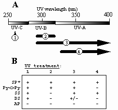 Fig.5. A. UV treatments to which spores have been exposed. 1, artificial UV-C (254 nm); 2, artificial UV-B (290-310 nm); 3, full-spectrum sunlight (>290 nm); 4, "UV-A" sunlight (>325 nm). B. Summary of B. subtilis spore photochemistry at different artificial and environmental UV wavelengths. UV treatments are numbered as in part (A). SP, spore photoproduct; Py<>Py, cyclobutyl pyrimidine dimers; SS, single-strand breaks; DS, double-strand breaks; AP, apurinic/apyrimidinic sites. +, damage detected; +/-, damage barely detectable; -, damage not detected. *SP data are from Tyrrell (1978).