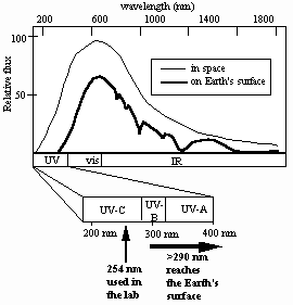 How well does the current laboratory model describe spore UV resistance in the environment? Solar radiation reaching the Earth’s surface is considerably more complex than artificially-produced monochromatic 254-nm UV,consisting of a mixture of UV, visible, and infrared radiation, the UV portion spanning approximately 290-400 nm (the so-called UV-B and UV-A portions of the UV spectrum) (Urbach and Gange, 1986) (Fig. 1).