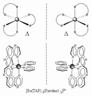 The octahedral geometry of Ru(II) complexes induces their chirality. The Ru(II) center complexed with 3 bidentate ligands present two different enantiomers as represented on this figure. The same chirality is present with complexes having two monodentate ligands in cis position such as [Ru(TAP)2(pyridine)2]2+, one of the complexes we tried to resolve in its enantiomers.