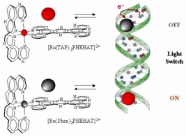 The photophysical properties described in part I of this introduction are particularly convenient to design Ru(II) complexes as photoprobes of the genetic material. In this part, potential applications are described such as the light switch effect (first scheme) and the chiral recognition of secondary structure of DNA (second scheme).