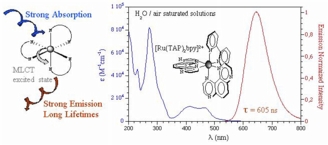 a strong absorption (Metal to Ligand Charge Transfer) in the visible range. The Ru(II) complexes can be irradiated by visible light, without affecting DNA which absorbs in the U.V. an intense and environment-sensitive luminescence from their triplet 3MLCT state. A long luminescent lifetime increases the probability of reaction in the excited state and is an advantage in designing photoprobes also as it is easily detected. due to the diversity of ligand accessible, the size, shape and hydrophobicity together with their spectroscopic characteristics, photophysics, and photochemistry (redox properties), may be easily tuned. stable enantiomers which enables the potential use of these complexes as stereoselective probes. click to get full size picture and more information
