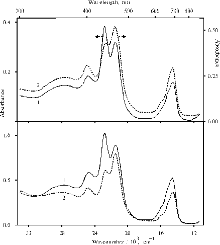 Changes of absorption spectra with a change of porphyrin concentration (panel A) and similar changes of the same solution but in the presence of glycerol with time (panel B) and the following in several days appearance of a slight green precipitate indicate aggregation of the porphyrin.