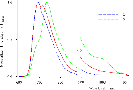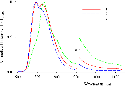 On excitation at 403 and 437 nm, two maxima or maximum and a shoulder of the main emission are observed at 693 and 730 nm in the fluorescence spectra (Fig. 3, curves 1 and 2), while the spectrum on the excitation at 465 nm exhibits only one maximum at 732 nm and two shoulders at 693 and ca. 800 nm (curve 3). The spectrum on the excitation at 465 nm (Fig. 2, curve 3) exhibits an appreciable shoulder of near IR emission at 1000 nm and maximum of the main emission at 735 nm. Similar IR emission has been found in solution and in thin films of TPP amino derivatives in the presence of water traces, and donor-acceptor complexes involving water are the radiative centers [2-3]. The maximum at 730-730 nm is suggested to be associated with the second intermediate state of mono-protonated dimer possessing trans NH configuration of the tautomeric isomer.