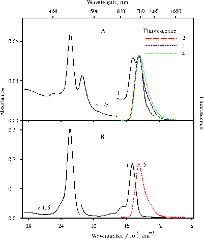 Fig. 5. Absorption (1) and fluorescence spectra (2-4) of TPP, panel A: in water-ethanol solution (91 : 9, v/v) in the presence of 0.4 N hydrochloric acid, 1; on excitation at 403 nm, 2; 437 nm, 3; and 465 nm, 4; panel B: in 50% aqueous solution of acetone (v/v) in the presence of 0.2 N hydrochloric acid, 1; on excitation at 437 nm, 2. The fluorescence spectra are normalized on the intensity of main emission band.