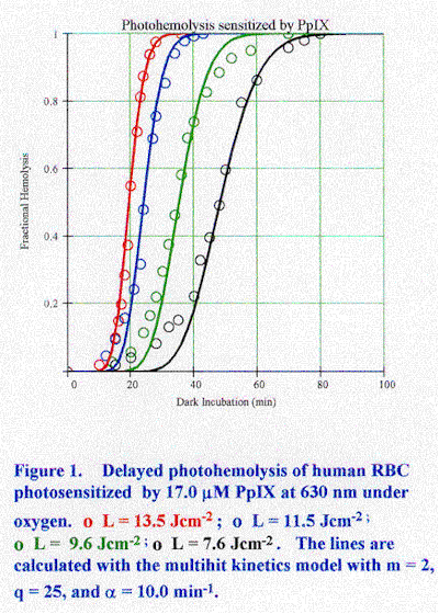 Abstract Photosensitized photohemolysis of red blood cells in vitro has been investigated for many dyes, pigments, and drugs for more than fifty years. Considerable evidence supports the "colloid-osmotic" model which postulates that photochemical damage to the cell membrane leads to cation release and cell swelling followed by hemolysis during dark incubation. The involvement of singlet molecular oxygen has been shown for halogenated fluoresceins, porphyrins, and phthalocyanine photosensitizers. The relative importance of membrane protein and lipid targets has not been resolved. Two recent kinetics models are reviewed which are consistent with the key experimental observations. 1. Introduction It has been known for a long time that exposure of grazing animals to sunlight after they ingest certain plants induces inflammation, ulceration, infection, and in severe cases, convulsions and death. This disease is hypericism[Giese, 1971]. In some regions of Arabia white horses were not used and even unpigmented patches on colored horses were darkened with henna or tobacco juice. In the Tarentine fields of Italy only black sheep were grown because the white ones grew ill after exposure to sunlight. The connection between plants of the genus Hypericum and the sunlight sensitivity of range animals was made in the 19th century, if not earlier. The active photosensitizer was identified with the anthraquinoid pigment hypericin (1,3,6,8,13-hexahydroxy-10,11,dimethyl-phenanthrol [1,10,9,8-opqra] perylene-7,14-dione). Hypericin (HY) is a potent in vitro photosensitizer of red blood cells (RBC). Incubation of an RBC suspension with HY and exposure to light induces membrane lysis and release of hemoglobin to the external medium. This phenomenon is photohemolysis. The early study of Blum [1941] showed that photosensitization of hemolysis by HY requires oxygen. This reaction is a classical type of "photodynamic action" - a harmful biological effect driven by light which requires the presence of a photosensitizer and oxygen. Many chemicals, dyes, and drugs photosensitize in vitro hemolysis. Some of these agents also photosensitize human and animal skin to sunlight. This correlation has motivated the use of photohemolysis as a test for potential skin photosensitizers. The detailed action mechanism of photohemolysis has not been adequately explained notwithstanding more than fifty years of investigations. RBC are highly reproducible model systems for the study of cell membrane damage. There has been considerable recent interest in the heightened sensitivity of cells to oxidant damage in hereditary disorders, such as sickle cell disease and other hemoglobinopathies. Cumulative oxidative damage generates immunologically recognized alterations in the cell surface that may promote binding of autologous antibodies and clearance of senescent cells from the circulation. Photohemolysis may be involved in the action mechanism of photodynamic therapy (PDT) in which occulsion of small blood vessels occurs during the early stages of the procedure [Ben-Hur et al., 1990]. The "colloid-osmotic" model is generally accepted as the basic explanation for photohemolysis[Davson and Ponder, 1940]. According to this theory, photochemical damage to the RBC membrane initiates cation leakage, followed by swelling of the cells and hemolysis. These responses to light have been observed experimentally. Other effects which may be related to the photohemolysis mechanism include changes in RBC morphology and fragility induced by dark binding of some photosensitizers, photoperoxidation of membrane lipids, photolysis and photocrosslinking of membrane proteins, and photooxidation of encapsulated hemoglobin. The relationship between specific damage modalities in the photochemical stage of the process and hemolysis during dark incubation has not been established. Different primary photochemical reactions are feasible depending on the photosensitizer and reaction conditions. These include the well-known Type 1 (sensitizer-substrate) and Type 2 (sensitizer-oxygen) photosensitization pathways mediated by the sensitizer triplet state and singlet molecular oxygen (1Dg), respectively. Another possible mechanism involves membrane disruption induced by photolysis products. This paper reviews the current status of photohemolysis research. An attempt has been made to focus on the mechanistic issues by citing illustrative results. The author welcomes additional input and comments. 2. Photohemolysis measurements Photohemolysis is observed by exposing an RBC suspension to light and then spinning down the intact cells leaving hemoglobin in the supernatant. A convenient assay procedure utilizes light scattering because the transmission of far-red light by an RBC suspension is proportional to the concentration of intact cells. The photohemolysis rate may be quantified by either of two techniques. In continuous photohemolysis (CPH) the fraction of hemolyzed cells is measured during the irradiation. In post-irradiation or delayed photohemolysis (DPH) the cells are exposed to a brief, non-hemolyzing irradiation and hemolysis is measured during incubation in the dark. DPH and CPH curves are sigmoidal frequently with an initial delay period. The time required to achieve 50% hemolysis (t50) is a useful rate parameter. t50 is measured from the start of irradiation for CPH and from the start of dark incubation for DPH. Photohemolysis kinetics are characterized by a non-linear dependence of the rate on the incident fluence and sensititizer concentration. Values of t50 from less than a minute to many days have been observed. Osmotic fragility is an alternative probe of light-activated damage to RBC membranes. Damaged cells undergo hemolysis at higher bath osmolalities than normal cells. DPH measurements can be performed in two ways. In one procedure, t50 is measured at different values of the incident fluence (F) for a constant total sensitizer concentration (Ct). The data