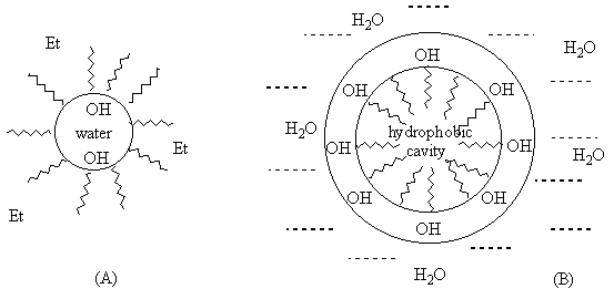 Figure 3. Representation of possible molecular aggregates of provitamin D in water-ethanol mixtures: (A) - ethanol is major component; (B) - water-rich systems Cyclodextrines, cyclic carbohydrates of different oligomeric forms [11], have been numerously used as enzyme mimetics [12], drug delivery systems [13] and have served for molecular recognition studies[14]. Cyclodextrins have a truncated cone like shape with a hydrophobic cavity. These compounds have the ability to form inclusion complexes with organic molecules and modify the energetics and chemical reactivity of their guest molecules [15]. Naturally, these so popular and readily available systems have been employed as microenvironment for studying the photochemistry of provitamin D, vitamin D and its isomers. In particular, the vitamin D/ß-cyclodextrin inclusion complex have been studied in details [16,17]. Irradiation of provitamin D/ß-cyclodextrin complex [17] results in a significant inhibition of tachysterol formation, which is discussed in view of the conformational shift in favour of cZc conformation of previtamin D. Photoisomerization of provitamin D have been also studied in thin film formed by evaporation of a chloroform solution on a glass slide [4a,b], on gel-bond (GB, an agarose gel support), polymer films ( poly-methylmethacrylate, PMMA; polyethylene, PE; polystyrene, PS) [4a,15] and CHOC liquid crystal film [18]. In the case of the provitamin D thin film on glass [4a] only previtamin D formation has been observed although at low conversion. In all the other cases, the reduction of tachysterol formation occurs depending on the polymer used. In [18], it is concluded that the decrease of free volume in this films is not large enough for selective synthesis of previtamin D, and that the effects of specific orientation or local interaction with the molecular assembly in films are of determining role. Interestingly to note that PMMA film, which is transparent in the UVA and UVB region, slightly reduces the efficiency of cis-trans isomerization in comparison with hexane solution (1. 47 times) in spite of the significant change in free volume. But in CHOC liquid crystal film the isomerization to tachysterol is favoured. Its accumulation at photostationary state is 1.17 times more than in hexane solution [18]. Unfortunately, in that study the different transparency of the systems have not been taken into account, which may significantly affect the active irradiation spectrum. This complicates a comparison. The strong inhibition of tachysterol formation found in polystyrene films which is similar like in toluene solutions may be attributed to a wavelength effect, by filtering out the short wavelengths around 254 nm so that the long wavelength irradiation around 313 nm becomes dominant. In [4a], photolysis of provitamin D have been studied on silica gel (SG) TLC plates. Similar to the situation in liposomes, the photolysis on SG produces an increased steady-state product ratio of previtamin D to tachysterol. Silica gel adsorption stimulates irreversible degradation of the reaction products, which could not be prevented by standard experimental procedures. The effect of the kinetics of provitamin D photoisomerization by adsorption on silica gel surface have been studied in silica gel/solvent matrices [4c]. It has been suggested that adsorption of provitamin D and its photoisomers on the surface occurs via hydrogen bonding between the C3-hydroxyl-group of the steroid and surface active absorption centers ( surface water or Si-OH groups). Hydrophobic and electrostatic interactions restrict intramolecular rotation around previtamin D´s single bonds and provide an orientation resulting in minimal contact of the steroids hydrophobic area with the water-saturated surface of the solid support. As a consequence rotation barriers are increased and previtamin D shifts its conformational equilibrium in favour of its cZc conformer (Figure 4).