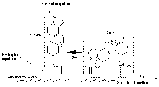 Figure 4. Pictorial representation of conformational shift caused by SiO 2 surface via hydrophobic repulsion between hydrophylic tail (R) and skeleton of previtamin D and water-saturated silica surface. Adsorbates of minimal imaginary projection on the surface should be mostly populated due to minimization of hydrophobic interactions. OH group of the steroid molecule is H-bonded to the active surface sites (coordinated water, surface hydroxyls [19])The effect by complexing previtamin D with silanol derivatives, formed via hydrogen bonds, on their conformational equilibrium has been calculated by use of MMX force-field (PCMODEL) in [20]. An increase in the population of cZc conformers with increasing the size of the silanol molecules (as a model for SiO2 surface) was observed. These calculations support the experimentally suggested conformational shift in previtamin D caused by the silica dioxide surface [4b-e]. III. Effects of UV-irradiation Provitamin D and its main photoisomers absorb in the same UV-region (Figure 5) and being excited they all interconvert by photoisomerizations (Figure1). In addition previtamin D and tachysterol undergo irreversible conversions into toxisterols with different efficiencies. This results in complex reaction mixtures. The composition strongly depends on the wavelength of irradiation applied [21-23 and references therein].