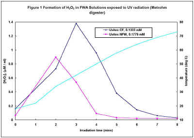 UVITEX NFW The enzymes catalase (ex bovine liver) and superoxide dismutase (SOD) were obtained from Bohringer Mannheim (Castle Hill, NSW). Ferrous ammonium sulphate, xylenol orange and sorbitol were obtained from Aldrich (Castle Hill, NSW). Hydrogen peroxide (50% w/w) was obtained from Interox (Melbourne, VIC). 2.2 Irradiation conditions In initial studies aqueous solutions of FWAs were irradiated using a commercial Metrohm 705 UV digester (Metrohm, Switzerland) designed to eliminate moderate amounts of dissolved organic matter from water samples before analysis. The device consists of a water-cooled high-pressure mercury arc surrounded by an annular rack containing twelve quartz sample tubes. The spectral output of the mercury arc covers the whole gamut of wavelengths from UVC to near infrared, and produces a significant amount of heat. Sample temperatures of 70-80oC were obtained after 10 minutes irradiation. Further studies were carried out using a custom-built UVA irradiation apparatus containing up to twelve Pyrex tubes held in an annular carousel around a central blacklight UVA source (Eye H125BL, Iwasaki Electric Co, Tokyo). This apparatus produced peak output between 360-370 nm and no UV radiation below 300 nm. The lamp was cooled by incorporating a small fan beneath the sample carousel, and the temperature of the solutions during irradiation was kept below 30oC even during extended (up to 6 h) irradiation periods. Radiation intensity was measured using an IL7000 radiometer (International Light, USA) fitted with an SED033/UVA/W detector and filter attachment and calibrated to measure peak irradiance at 360 nm, and was typically 14 mW.cm -2 at the sample position. 2.3 Chemical analyses Hydrogen peroxide was assayed using the xylenol orange technique described by Jiang et al [8]. H2O2 oxidises iron (II) to iron (III) in the presence of sorbitol, which acts as a catalyst. Iron (III) then forms a purple complex with xylenol orange. A 5 cm3 aliquot of irradiated FWA solution was placed in a 25 cm3 graduated flask, and mixed with 2.5 cm3 each of sorbitol (0.1 M), sulphuric acid (0.25 M) and xylenol orange (1.0 mM). The reaction was initiated by the addition of 2.5 cm3 of ferrous ammonium sulphate (2.5 mM) prepared fresh daily, RO water was added to make up to 25 cm3, and the flask was then shaken for 45 minutes. After shaking the absorbance at 560 nm was determined and compared with a hydrogen peroxide standard curve. The concentration of H2O2 in stock solutions was calculated using the extinction coefficient of 43.6 M-1.cm-1 at 240 nm. When catalase is added to the FWA aliquot before carrying out the assay, any H2O2 is selectively converted to water and oxygen. As catalase is specific for H2O2,the presence of any other oxidants capable of producing iron (III), including organic hydroperoxides ROOH, can be discriminated. 2.4 Fluorescence spectroscopy Three-dimensional fluorescence spectra of FWA solutions were obtained using a Hitachi F4500 fluorescence spectrophotometer. Data manipulation and contour plotting were carried out using SAS/Graph software version 6.12 (SAS Institute, Cary, NC). 3. Results 3.1 Production of hydrogen peroxide In an initial experiment, aqueous solutions (0.01% w/v) of the two FWAs were irradiated for brief periods up to 10 minutes in the Metrohm UV digester. Immediately following irradiation, aliquots of these solutions were analysed for H2O2 using the xylenol orange technique. Figure 1 shows that both Uvitex CF and NFW produce H2O2 but the concentration decreases after 2-3 minutes irradiation. Figure 1 also shows that the temperature of the solutions increases rapidly through the course of the experiment, and further irradiation experiments using the Metrohm digester were restricted to 2 minutes. Figure 1 (77k) The generation of H2O2 by irradiation of various concentrations of Uvitex NFW for 2 minutes in the Metrohm digester is shown in Figure 2. The variation of H2O2 production with FWA concentration under these conditions appears to be a complex function which is dependent on several variables, likely to include concentration quenching effects and oxygen availability. Figure 2 also shows data for samples to which catalase (~500 units) was added and shaken for 5 minutes before peroxide analysis, which shows little or no H2O2 is present. Since catalase is specific for H2O2, converting it rapidly to water and oxygen, this proves that H2O2 is being generated on photolysis of Uvitex NFW. Figure 2 (60k) Having demonstrated the generation of H2O2 from solutions of stilbene-based FWAs using a high-pressure mercury source, it was of interest to investigate the wavelength dependence of the process. For commercial FWAs it is their photochemistry on exposure to sunlight which is important, and in particular exposure to UVA (320-400 nm) which is a more significant fraction of solar spectrum than lower wavelengths and includes the wavelengths responsible for their excitation. Also the high temperatures generated during exposure in the Metrohm digester were undesirable and could cause decomposition of H2O2. Generation of hydroxyl radicals also occurs when H2O2 is exposed to wavelengths below 280 nm - indeed photolytic generation of these radicals followed by their rapid reaction with trace organics is the principle of operation of the Metrohm digester. Figure 3 Solutions of Uvitex NFW (0.1779 mM) were exposed in the UVA irradiator for periods up to 2 hours and analysed for H2O2. Figure 3 shows that the generation of peroxide with UVA irradiation time is almost linear up to 90 minutes. Figure 4 shows the effect that variation of FWA concentration has on H2O2 formation after UVA irradiation for 1 hour - again the behaviour appears complex. Figure 4 3.2 Evidence for involvement of superoxide radical anion Figure 3 shows the effect of adding SOD (250 Units/ml) to Uvitex NFW solution before irradiation, which results in the generation of significantly higher levels of H2O2 (5