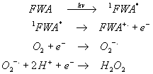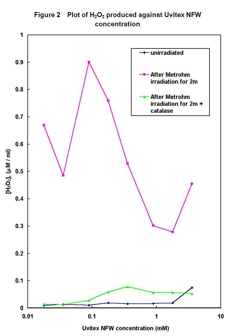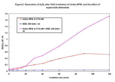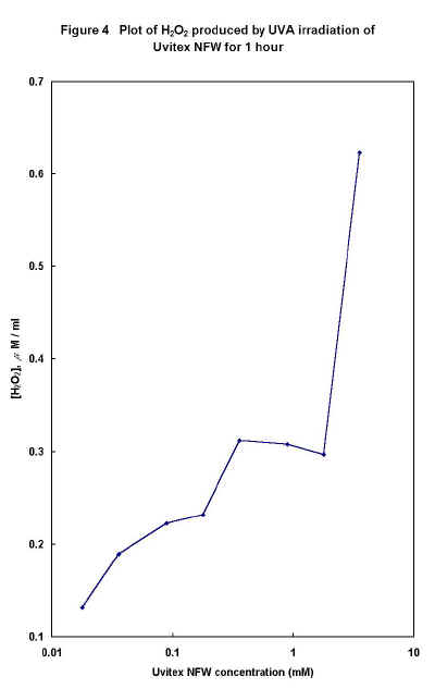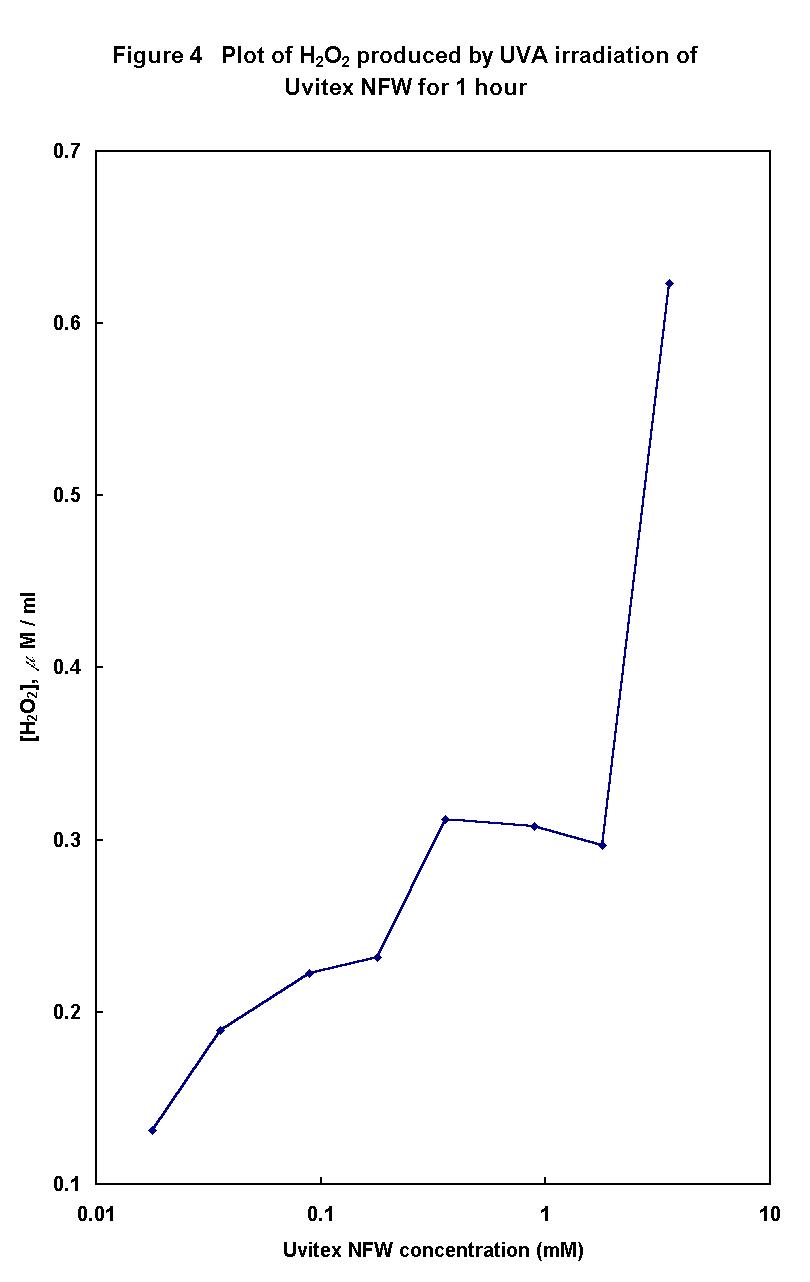 Figure 5 (large file, 369k) 4. Discussion The almost linear increase in H2O2 formation with time during UVA irradiation and the increased levels formed in the presence of SOD (Figure 3) suggest that H2O2 is produced by dismutation of the superoxide anion. Superoxide is generated via electron transfer to molecular oxygen, which suggests that photoionisation of the excited singlet state of the FWA probably occurs, ie.