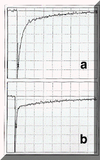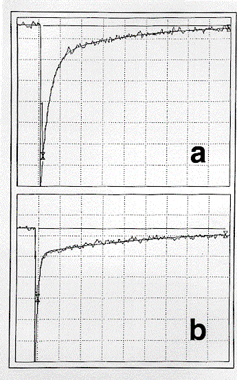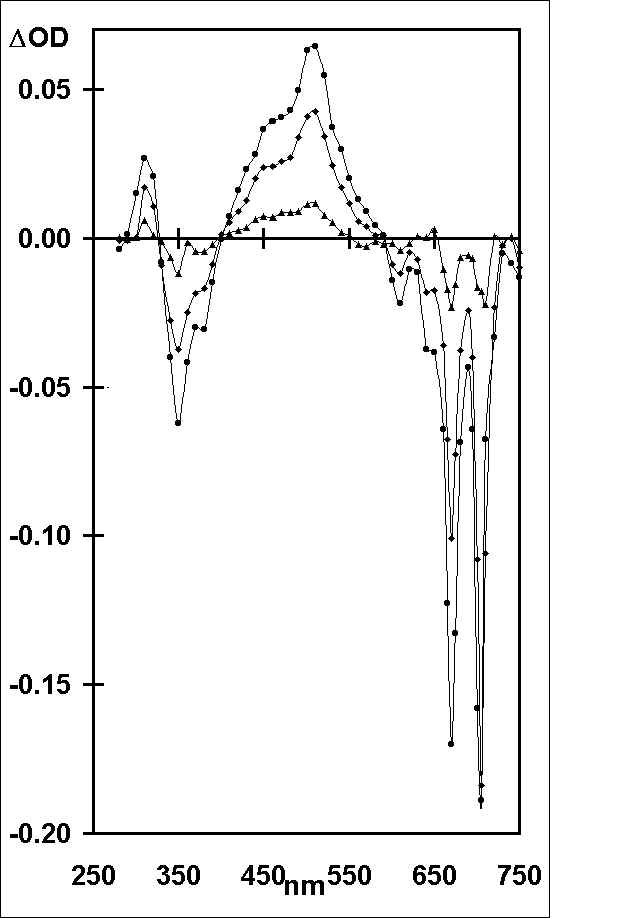 3. Results and Discussian The triplet, 3OHPC*, was initially characterised in deaerated benzene using a combination of standard pulse radiolysis and laser flash photolysis techniques to be fully described elsewhere. Parameters determined were lmax 500 nm (e500 = 32,500 ± 5,000 l mol-1 cm-1), fT = 0.19 ± 0.04, tT = 143 ± 23 ms and kT = (7.0 ± 1.0) x 103 s-1. The decay of the triplet was absolutely clean, i.e. no process other than decay to ground state was observed. In Figure 1 are shown transient absorption/bleaching spectra following laser excitation (355 nm; 15 ns pulse) of OHPC (1.05 x 10-5 mol l-1; A355 = 0.63) in benzene containing a low concentration of oxygen (2.2 x 10-4 mol l-1). The spectra which are a combination of the triplet absorption and corresponding ground-state bleaching of OHPC are identical to those observed by pulse radiolysis and essentially unchanged over the whole time profile. The kinetics of the transient absorption/bleaching decay were (a) independent of wavelength and (b) biexponential (Figure 2(a)), showing rapid decay to an equilibrium followed by slow bleeding of that equilibrium (cf. eq 1). Extrapolation of the fast and slow Figure 1. Transient absorption/bleaching changes with time after laser excitation of OHPC (A355 = 0.63) at 355 nm in benzene containing oxygen (2.2 x 10-4 mol l-1), measured at 2.7 (circles), 5.0 (diamonds) and 25 (triangles) ms, after the laser pulse. Figure 2. (a) Transient absorption corresponding to Figure 1, at 500 nm, 2.1% absorption/division, 10 ms/division, k1 = 2.8 x 105 s-1(calc. 3.2 x 105 s-1), k2 = 2.8 x 104 s-1 (calc. 2.7 x 104 s-1), Ai = 7.4 x 10-2, Ae = 1.7 x 10-2. (b) As for (a) with A355 = 0.57 in benzene-d6, 0.96% absorption/division, 50 ms/division, k1 = 2.6 x 105 s-1 (calc. 3.2 x 105 s-1), k2 = 3.1 x 103 s-1 (calc. 2.8 x 103 s-1), Ai = 2.2 x 10-2, Ae = 4.7 x 10-3.