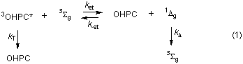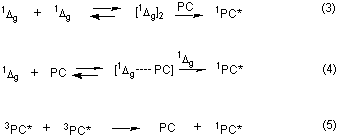 involving two 1Dg molecules and a PC ground state in the sensitization step (cf. eqs 3 and 4).2,4 It is only 500 times more probable than the classical triplet-triplet annihilation process (cf. eq 5) which is also a clear mechanistic contender. These ratios are independent of the phthalocyanine concentration employed when the oxygen concentration is orders of magnitude higher. Thus, an accurate knowledge of the phthalocyanine triplet energy provides strong support for our conclusion2 that 1Dg -sensitized phthalocyanine luminescence is a further example of the well-documented Ogryzlo-Pearson-Wilson mechanism16,17, involving clear sequential transfers of triplet energy from two 1Dg molecules, first to the PC ground state, secondly to the thus formed PC triplet state. We wish to thank the University of Manchester Samuel Gratrix Fund and the EPSRC (U.K.) for financial support and Dr. N. B. McKeown for a generous gift of OHPC. The experiments described were performed at the Paterson Institute for Cancer Research Free Radical Research Facility, the Christie Hospital NHS Trust, Manchester. The Facility is funded under the European Commission TMR PROGRAMME - ACCESS TO LARGE SCALE FACILITIES, Grant ERBFMGECT 950084 - Access to PICR FRR Facility.