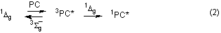 The equilibrium of eq 1, defined as K = [Ai - Ae] [OHPC] [Ae]-1 [3Sg]-1 = 0.17 ± 0.04, is displaced to the left by the spin statistical factor of 1/9 associated with ket.13 Appropriate correction and a standard assumption of no entropic changes gave DH = -0.25 ± 0.16 kcal mol-1 and a value of 22.8 ± 0.2 kcal 1Dg for the triplet energy of OHPC. This is very significantly different to the published figure of 28.7 kcal mol-1 for phthalocyanine itself 6 and, as anticipated, is very close to that of b-carotene. Determination of ket as 1.2 x 109 l mol-1 s-1 in experiments using much higher oxygen concentrations allowed a value of 7.1 x 109 mol l-1 to be assigned to k-et. Our values for ket, k-et, and kT, together with kD = 3.2 x 104 s-1 14 (cf. eq 1) allowed calculation13,15 of the first-order constants for decay to (k1) and decay of (k2) the equilibrium of eq 1 which were in good agreement with experiment (cf. Figure 2(a)). Laser excitation in deaerated benzene-d6 resulted in the same clean formation and decay of 3OHPC* with an identical kT. However, whereas in the presence of 2.2 x 10- 4 oxygen (cf. Figure 2(b)), decay to equilibrium proceeded with an essentialy identical k1, the rate constant for decay, k2, of that equilibrium was much slower, 3.1 x 103 s-1 since kD is now only 1.7 x 103 s-1.14 The calculated13,15 value is clearly in good agreement with experiment. Thus, in this benzene-d6 experiment, 3OHPC* decays by a factor of 2-3 slower than in the deaerated medium, further evidence for the establishment of an equilibrium with1Dg. As expected, in both benzene and benzene-d6 , the time profile of the 1270 nm emission of the 1Dg state followed that of the long-lived triplet decay. The long risetime of the emission detection system coupled with immediate phthalocyanine fluorescence prevented observation of the 1Dg emission growth.The equilibrium constant for benzene-d6, determined as described above, was identical to that in benzene as were the corresponding benzene and benzene-d6 values for TBPC. In the published work where time-resolved 1Dg-sensitized phthalocyanine (PC) fluorescence has been observed,2-4 the equilibrium of eq 3 will have been established before monitoring of the delayed fluorescence began, i.e. the key concentrations are equilibrium concentrations. For instance, we have determined the rate constants for quenching of 2-acetonaphthone triplet by OHPC and by oxygen to be 7.5 x 109 l mol-1 s-1 and 1.6 x 109 l mol-1 s-1 respectively, essentially identical to ket and k-et respectively as one might anticipate from the nature of the processes involved. Thus, in our sensitized luminescence experiments3 the developing relative concentrations of 1Dg and 3OHPC* will be essentially those of the equilibrium situation. If the phthalocyanine absorbs any of the incident light (~ 5 % in our experiments)3 the initial 3OHPC* concentration will be higher than that at equilibrium which will then be established within 500 ns in aerated benzene.The knowledge that we are dealing with an equilibrium situation allows us to conclude that the sensitization event in the 1Dg -sensitized production of PC fluorescence is that of the second step depicted in eq 2. It is spin-allowed, exothermic by at least