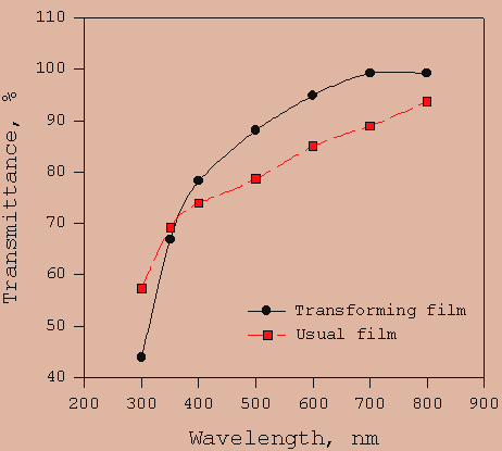 Fig. 1a. Spectrum of transmittance of usual and UV-transforming PolyQ-films.