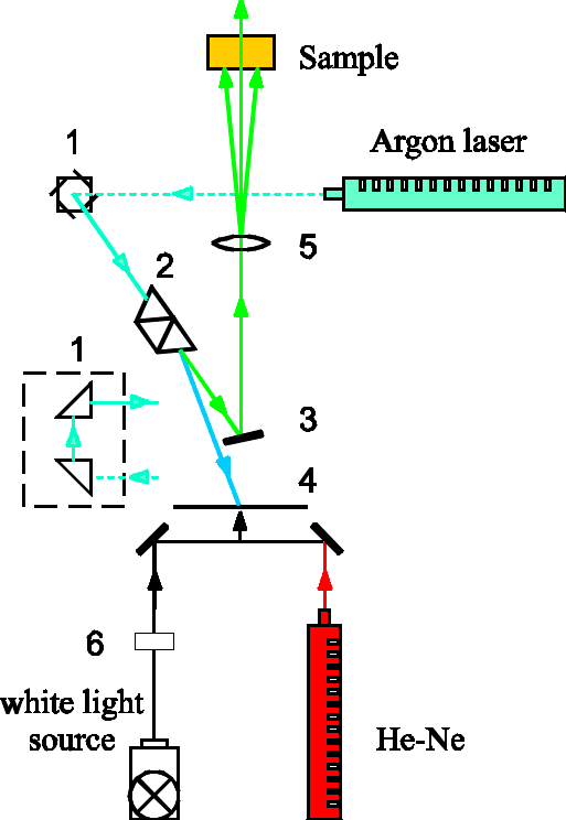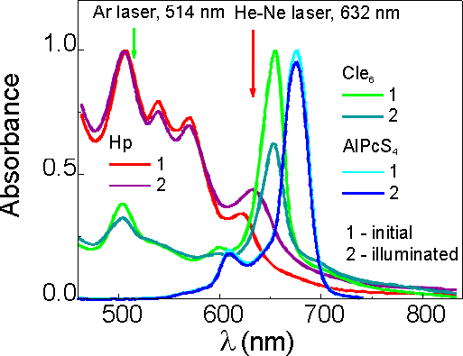 Hybrids of mice BDF1 (weighing 21±3 g) bearing hepatoma 22 (10±2 mm in diameter) were divided into two groups: I - control and II - experimental group. Photosensitizer photosan PS was injected into animals of group II intraperitoneally at a dosage of 10 mg/kg. After 24 h animals were killed (in the state of ether anesthesia) and the samples of hepatoma 22 were removed into physiological saline. The autofluorescence of both control (group I) and sensitized cancerous tissue (group II) was recorded ex vivo before the illumination, then the monitoring of the light-induced changes in fluorescence spectra of photosensitizer accumulated in tissues was performed. To induce phototransformation, the samples (2 ml of the solution in quartz cuvettes; path length, 1 cm) were illuminated with an Ar-ion laser (wavelength, 514 nm; light fluence rate, < 100 mW cm-2) and a He-Ne laser (wavelength, 632 nm; light fluence rate, < 25 mW cm-2) (Fig.3). Fig.3 Setup for the irradiation of samples: 1- full reflection prisms, 2- dispersal system, 3- mirror, 4- screen, 5- condensing lens, 6- water filter. Since different photosensitizers of equal concentration have different optical densities A(l ill) at the illumination wavelength, that should be taken into account when their photobleaching efficiencies are compared. Bleaching of absorption, DA(l bl), also differs in magnitude depending on the wavelength at which it has been measured (Fig.4). Fig.4 Normalized absorption spectra of Hp, Cle6 and AlPcS4 in PBS (pH 7.2) before and after illumination. In order to eliminate this dependence, we used relative absorbance values for the bleaching, obtained dividing DA(l bl) by the value of the initial absorption, A(l ill), at the wavelength of illumination, and also dividing by value of initial absorption, A(l bl), at the wavelength of the measurement: where DA(l bl) is the absorption bleaching at the wavelength of the measurement, l bl, estimated from the absorption difference spectrum after the illumination; A(l bl) and A(l ill) are the initial absorption values estimated at l bl and l ill, respectively. The relative values of absorbance used when the rate of photoproduct formation was under evaluation were obtained by following equation: where D A(l p) is the increase of absorption estimated at the peak of the photoproduct absorption band from the absorption difference spectrum after the illumination, A(l ill) is the initial absorbance value estimated at l ill.