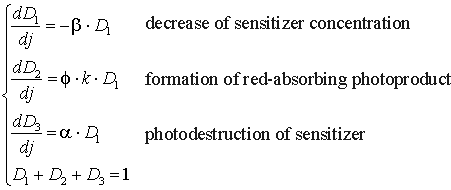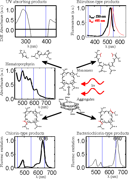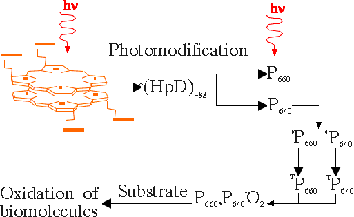 The mechanism of PTT is still unclear. It is generally accepted that the sensitization process is singlet oxygen- mediated and aggregates of porphyrin type photosensitizers are efficient in PTT because of the better accumulation in cancerous tissues. However, porphyrin aggregates are less efficient generators of singlet oxygen than monomers [18,19]. This contradiction is possible to overcome if the photomodification of photosensitizer is involved in sensitization process. Under illumination the "sandwich" type equilibrium aggregates are preferably photomodified into the chlorin-type (PhP 640) and bacteriochlorin-type (PhP 660) photoproducts [20-22]. If the first light quantum absorbed by aggregated species (bad generators of singlet oxygen) transforms them to the red-absorbing photoproducts (Fig.14), then, since the photoproduct absorbs the radiation of light sources commonly used in PTT, the next light quantum may be absorbed by the formed chlorin-type photoproduct. Fig.14 Suggested participation of photoproducts in photosensitization process. The chlorin-type molecules, which have higher absorption in the red spectral region and are good generators of singlet oxygen, may act as good photosensitizers. Thus, the capacity of aggregated species to generate singlet oxygen increases due to the phototransformation to chlorin-type photoproducts. Modification of photochemical dose The results of our experiments in model systems (photosensitizer complexed with HSA, or in a suspension of resealed erythrocyte ghosts) and in tumour tissue show that photoproducts are formed in all investigated preparations (Figs. 8,10,11). The similar light-induced changes of fluorescence spectra were also observed in vivo by other authors [13-15]. Since the formed photoproduct itself can act as photosensitizer and induce the positive photodynamic effect [17], we have made some modifications in the calculations of PD taking into account the formation of the photoproduct. So, if the decrease of photosensitizer concentration occurring with the rate constant b and being reflected by photobleaching, is caused by the photodestruction of photosensitizer with rate constant a, and simultaneous formation of red-absorbing photoproduct with rate constant k, these processes could be described with the following system of equations: where D1, D2 and D3 are the concentrations of photosensitizer, red-absorbing photoproduct and destruction products correspondingly, b, k and a are the rate constants of the corresponding photoprocesses, f is a quantum yield of the formation of the red-absorbing photoproduct. The photochemical dose in this case will be determined by the summed effect of photosensitizer and red-absorbing photoproduct: After solving the system, an integration of the obtained D1, and D2 values gives the modified formula for the calculation of PD: where D10 is a concentration of photosensitizer before illumination.