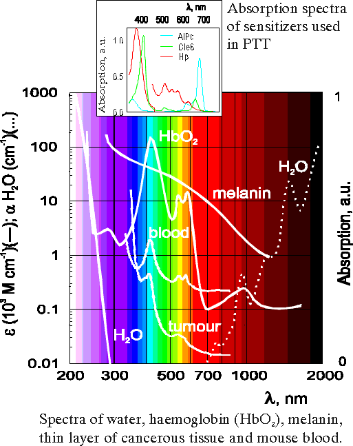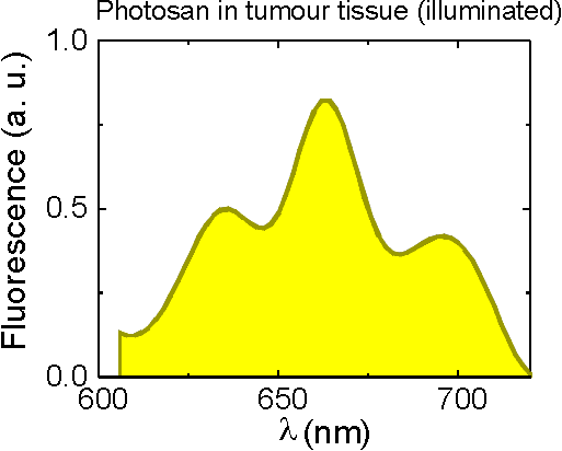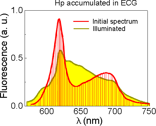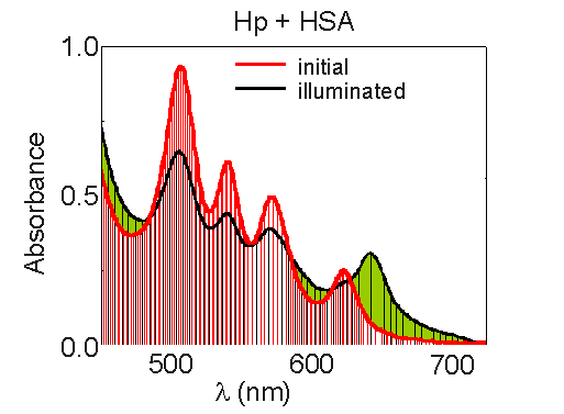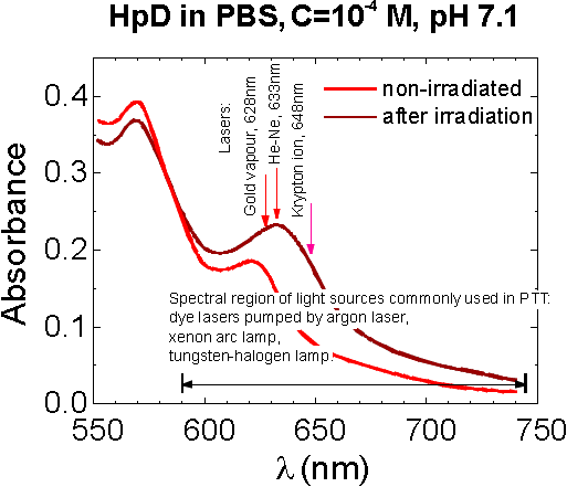 It is clearly seen that the interaction of photosensitizer with molecules present in cell substrate accelerates the photoproduct formation. The photoproduct is also formed in cancerous tissue ex vivo. Therefore it might be expected that photoproduct formed during the clinical treatment could influence PTT efficiency. For the illumination of tumours the red light (l ~ 630 nm) is used in clinical treatment because of its deeper penetration into the tissue (Fig.12). Since the photoproduct 640 has a broad absorption band in this region (Fig.13) and shows the photosensitizing activity [17] the additional photosensitization which comes from photoproduct must be included in the calculation of the efficient photochemical doses.