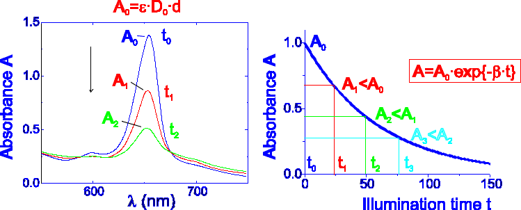 All investigated photosensitizers undergo phototransformations on illumination but photoinduced spectral changes are different. In the absorption difference spectra of AlPcS4, measured at different illumination doses, only slight photobleaching of absorption is detected (Fig.4). For the relatively photostable photosensitizers, AlPcS4 and TPPS4, simple geometrical definition of photochemical dose, PD=D0J0 (Fig.2), [1] (D0 is the concentration of photosensitizer, mg kg-1, J0 is the incident light dose, J cm-2) is useful, since only <1 % of the initial absorption of AlPcS4 and <10 % of the initial absorption of TPPS4 is bleached at the illumination dose of 200 J cm-2. Changes in the absorption spectrum of Cle6 during illumination by argon ion laser presented in Fig.4 show that the dominant process is decay of the absorption. When the photobleaching of photosensitizer is significant during illumination (Fig.5), as in the case of Cle6 (>50% of the initial absorption is decreased at the illumination dose of 100 J cm-2), equation (2) is valid. Fig.5 Significant decay of photosensitizer's absorbance occurring on illumination. With the increase of bleaching rate constant b the lower efficiency of PTT would be expected at the same illumination dose (Fig.6) due to decrease of concentration of photosensitizer. The optimal PD thus could be reached by the appropriate increase of illumination dose (time). Fig.6 illustrates the case when the photosensitizer concentration is independent of the light dose, and when it decreases as a result of photobleaching with the rate constant b. However, the achieved PD, which is equal to the area below the curves, is the same in both cases. Fig.6 a) photodestruction of unstable photosensitizer reflected by higher value of b finally results in lower photochemical dose; b) the same photochemical dose could be reached when illumination dose (time) is increased. It is not always possible to approximate the photobleaching of different photosensitizers by simple exponential relations, because most of them are complex mixtures and the dependencies of their bleaching on illumination doses have different characters. As it is shown in the phototransformation scheme in Fig.7 in addition to photobleaching, another transformation takes place on illumination of the porphyrin-type photosensitizers by light doses commonly used in PTT. The latter process is slightly dependent on the oxygen concentration and is accompanied by a decrease of the fluorescence and an appearance of absorption and fluorescence bands of the photoproduct at around 640 nm [9]. The illumination of DMHp, Hp, HpD, TPPS4, PS or PF in aqueous solution causes two processes: photoinduced destruction of porphyrin macrocycle and photoinduced chemical modification leaving the porphyrin macrocycle intact. For the most part the photoinduced destruction could be explained as the opening of the porphyrin ring, leading to the increase of light absorbance in the UV and visible region (formation of mono- and di-pyrroles and biliverdin-, bilirubin-type photoproducts). Photoinduced chemical modification leaving the porphyrin macrocycle intact is related to the formation of chlorin, bacteriochlorin or chlorin-porphyrin linked systems with absorption bands in the red spectral region (Fig.7). Fig.7 Phototransformation scheme for haematoporphyrin-type photosensitizers in aqueous medium. Formed UV absorbing and bilirubine-type products (Fig.7) are not interesting for PTT (if they don't induce dark toxicity) since they do not absorb the red light used for clinical treatment. The chlorin-type photoproducts have a broad absorption band in the red spectral region, and therefore careful calculation of the photochemical dose requires modified formula, which includes the formation of photoproducts. To get closer to the in vivo conditions the formation of photoproduct was also tested in model systems. Protein-bound porphyrins play a major role in photosensitized processes occurring in vivo and affect the efficiency of photoinduced cell damage. The interaction of photosensitizer with serum albumins may affect the sensitization process, generation of active species of oxygen and monomers-aggregates equilibrium. The presence of serum proteins may also alter the photostability and mechanism of photomodification of photosensitizers. Presence of HSA increases the photobleaching rate of the photosensitizer. The observed character of the absorption bands (Fig.8) of the photobleached product remains similar to that of porphyrin - type photosensitizers in aqueous solutions, indicating that the macrocycle is still largely intact. The sizable red shift of the first Q- band infers the formation of a chlorin type photoproduct. Fig.8 Changes of haematoporphyrin (conc. - 10-4 M) absorption spectrum in the presence of HSA (molar ratio 1:1) under illumination. Fig. 9a depicts the absorption decay curves of free Hp and Hp complexed with HSA. As is seen the photosensitizer-albumin interaction significantly accelerates photobleaching process especially at low illumination doses. This tendency is more or less characteristic of all investigated photosensitizers (DMHp, PS, PF, HpD, TPPS4 and Cle6). Fig.9 Kinetics of absorption decay registered at the maximum of third Q band (540 nm)(a) and formation of red-absorbing photoproduct registered at the maximum of formed photoproduct (640 nm) (b); the arbitrary values of absorbance for haematoporphyrin and photoproduct were obtained from absorption difference spectra by equation described above. The photoproduct formation rate curves for Hp are shown in Fig.9b. The initial rate of photoproduct formation is higher in the presence of HSA. In general, the presence of HSA in the solution of a Hp-type photosensitizer relatively stimulates the formation of a photoproduct at low doses of illumination in comparison with a photosensitizer in the absence of HSA. After prolonged illumination the ratio between the relative absorption