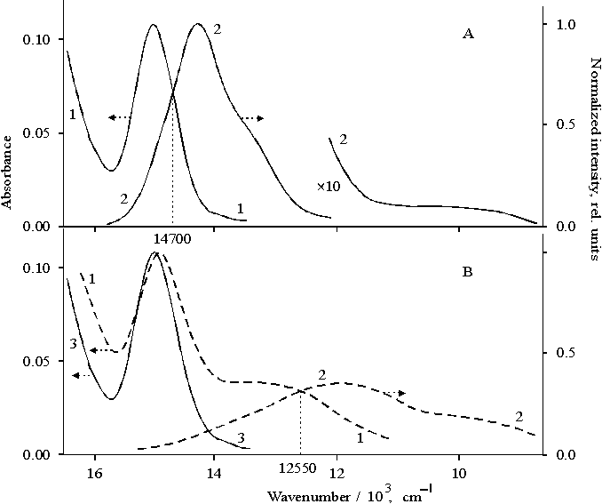 Fig. 1. Absorption (panel A: 1, panel B: 1, 3) and fluorescence spectra (panel A: 2, panel B: 2) of porphyrin II in DMF (panel A: 1 and 2) and in thin films in the presence of water traces (panel B: 1 and 2) and in water-free thin film (panel B: 3). This evidence shows that different forms of porphyrin associates are produced under different conditions of the development of intermolecular contacts, i.e. in the presence or absence of water traces in thin film. In addition to the main emission related to the deactivation of the excited state via Q electron transition, the fluorescence spectra of the porphyrin solution and thin film show three minor emissions: the emission in the 740800 nm region (shoulder) (i), in the near IR region, ~ 9001100 nm (shoulder) (ii), and a broad band with maximum at 845 nm (iii). Figure 2A presents absorption and fluorescence spectra of porphyrin II bound to copolymer I in DMF, where the degree of association of porphyrin is close to dimeric state [15]. The absorption band of Qx electron transition with the maximum at 652 nm (Fig. 2A curve 1) is narrow as compared with the band in the same transition in the spectrum (Fig. 2B, curve 1) with the maximum at 659 nm where the porphyrin has higher extent of association with respect to the dimer. In the latter case, so called "red tail" is observed. The main emission band of the dimeric form of porphyrin II bound to copolymer I (Fig. 2A, curve 2) is seen at 668 nm, i.e. the band is red shifted by 13 nm as compared with the same band in the spectrum of porphyrin I (curve 3). At the same time, the band of vibronic satellite of this transition observed at 718 nm in the dimer spectrum is not shifted but broadened as compared with the corresponding band in the spectrum of porphyrin I (compare curves 2 and 3). Note that the emission in the near IR region is almost not observed in the spectrum of the dimeric porphyrin bound to copolymer I.