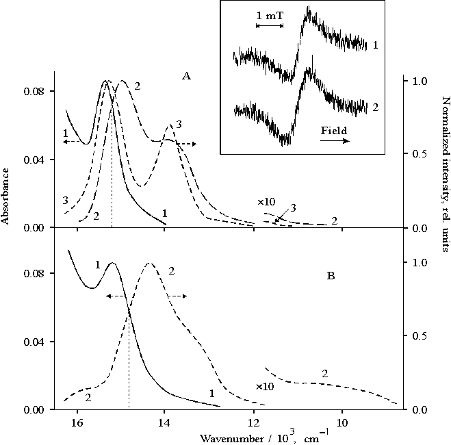 Fig. 2. Absorption (panel A: 1, panel B: 1) and fluorescence spectra (panel A: 2 and 3, panel B: 2) of porphyrin II bound to copolymer I (panel A: 1 and 2) and copolymer II (panel B: 1 and 2); porphyrin I (panel A: 3). The inset shows EPR spectra of porphyrin II bound to copolymer I, 1 and copolymer II, 2 under illumination with visible light (l > 400 nm). For dimeric form of porphyrin II bound to copolymer I, the EPR spectrum shows the signal with the g-factor of free electron and DHpp = 0.7 mT after visible light illumination (Fig. 2, the inset, curve 1). This EPR signal is related to radical cation of monomeric tetraphenylporphine [24]. In contrast, a broadened EPR signal with DHpp = 1.0 mT appears in the spectrum after the illumination of porphyrin II bound to copolymer II (curve 2) when porphyrin is characterized by a higher extent of association than that of the dimer. In addition to the main band with the maximum at 695 nm, the fluorescence spectrum of porphyrin associate shows the emission at 600630 nm (a shoulder), the shoulders at 740800 nm and in the near IR region (Fig. 2B, curve 2). The above minor emissions are absent in the fluorescence spectrum of monomeric porphyrin I (Fig. 2A, curve 3). Hence, these results indicate that the dimeric and associated states of porphyrin bound to copolymers I and II have their own specific features. The dimeric complex of porphyrin II bound to copolymer I is most likely to dissociate under the illumination with formation of monomer radical ions. Apparently, as a result of the dissociation the near IR emission is practically absent in the fluorescence spectrum. In contrast, the fluorescence spectrum of the associated porphyrin II bound to copolymer II shows the near IR emission, whereas in the corresponding EPR spectrum the abnormally broadened signal is observed as compared to that of monomer radical cation of porphyrin I. The associated form of porphyrin II bound to copolymer II, which provides the near IR emission, is found to show an unusual behavior under the interaction with quinone. The fluorescence spectra of this sample in the presence of p-benzoquinone are presented in Fig. 3. The main emission with maximum at 695 nm is quenched with increasing the concentration of the quinone whereas the near IR emission appreciably increases (curves 24). However, the near IR emission is also quenched at the concentrations of the quinone higher than ~ 60 mM. The plot of the intensity of the main fluorescence band and the near IR emission versus quinone concentration in solution is presented in Fig. 3, the inset. Linear regression analysis of this plot gives the straight line intersecting the y-axis exactly at the unity point (the inset, curve 1). At the same time, the near IR emission is described by the two lines because of the above mentioned features. In the first interval below 60 mM, the experimental values fit the straight line with a negative slope which corresponds to the burning up of the emission. However, extrapolation of this line to the y-axis does not give the intersection at unity. As evidenced by an abrupt slope of the plot (curve 3), an effective quenching of the near IR emission is observed in the second interval.