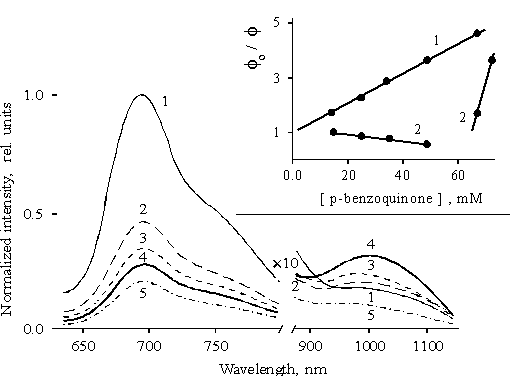 Fig. 3. Fluorescence spectra of porphyrin II bound to copolymer II in the presence of p-benzoquinone in concentrations: 1.5 · 102 M, 1; 2. 5 · 102 M, 2; 3.5 · 102 M, 3; 4.9 · 102 M, 4; 6.7 · 102 M, 5. The inset shows Stern-Volmer plots for quenching of the main fluorescence band, 1 and the near IR emission, 2, by p-benzoquinone.Hence, the absence of the proportionality between the quenching of the main fluorescence and the burning up of the near IR emission together with an unusual behavior of the near IR emission with changes in the concentration of quinone allow one to suggest that the burning up of the near IR emission is not related to the transfer of excitation from one form of the associated porphyrin to another. An increase in the emission at concentrations of quinone below 60 mM is associated with the quinone involved in donor-acceptor complex with the associated porphyrin, as a result of which the deactivation of the porphyrin increases via the lowest excited state. 2. Photochemical properties of meso-tetra(p-aminophenyl)porphine Illumination of porphyrin II with the visible light leads to the bleaching of the Soret band in a polar solvent whereas the illumination of the porphyrin in unpolar solvent such as diethylether does not show similar effect. The differential spectrum (the spectrum of porphyrin II in DMF after the 20-min visible light illumination minus the spectrum of the same solution before illumination) is presented in Fig. 4. By its characteristics, this spectrum may be attributed to di-cation of the associated (dimeric) porphyrin II [23] which is accumulated in the solution during illumination. The EPR spectrum of porphyrin II after 1-min illumination recorded at 77K is shown in Fig. 4, the inset, curve 1. In the spectrum, the signal with g-factor of free electron and DHpp = 0.98 mT is overlapped with the broader signal with DHpp = 3 4 mT (shown by arrows, curve 1). After defreezing of the solution, both signals disappear in the EPR spectrum (curve 2). The first broadened signal should be associated with radical cation of porphyrin whereas the second broadened signal is likely to be related to radical anion.