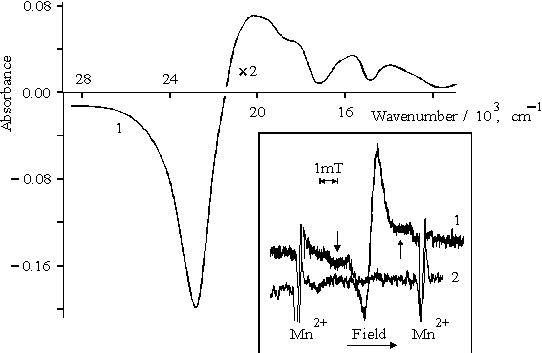 Fig. 4. Differential spectrum of porphyrin II in DMF, 1, see explanation in the text. The inset shows EPR spectra of porphyrin II in DMF under illumination with visible light (l > 400 nm), 1 and after defreezing of the latter, 2. Hence, these results show that radical-ion pair is formed under the illumination of the porphyrin II with visible light which is likely to dissociate to radical ions in the polar solvent. According to absorption spectra, when illumination exceeds several minutes, the radical cations may associate with the formation and accumulation of di-cation (Fig. 4). The quantum yield of the formation of the di-cation is found to depend markedly on the spectral composition of light used for illumination (Fig. 5). As compared with the white or filtered light (light filters: B, C, or D), the 3-fold decrease in the quantum yield is observed under violet-blue illumination in the Soret band (light filter: A) (table). Similar ratio between EPR signals is observed in the spectra as a result of violet-blue illumination (Fig. 5, the inset, curve 1) as compared with the visible light illumination (curve 2).