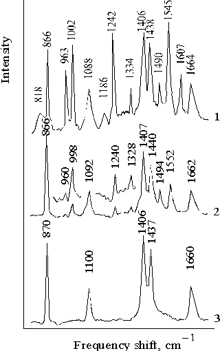 Fig. 6. Resonance Raman spectra of porphyrin II in DMF with excitation at lex = 441.6 nm, 1; lex = 514.5 nm, 2; and dimethylformamide with lex = 441.6 nm, 3. The spectra are normalized on the band of solvent at 868 ± 2 cm1. These results suggest that the effect of the increased intensity of the vibrational bands in porphyrin macrocycle induced by blue light (lex = 441.6 nm) and a marked decrease in the quantum yield of radical ions under illumination in the Soret band are the result of alternative processes. 3. Interaction of porphyrin dimers with proton Some properties of porphyrin II in the thin films in the presence of water traces may be simulated by the behavior of porphyrin I without amino groups in phenyl rings in the water-dioxane solutions. The difference between these two porphyrin systems is that during dimerization the molecules of porphyrin I may readily orient with respect to each other whereas orientation of molecules of porphyrin II may be controlled by amino groups because the presence of the amino groups results in strong association of this porphyrin. Furthermore, the results of IR-spectroscopy show that in the thin films of associated porphyrin II, water is involved in the structure of donor-acceptor complex formed by the molecules of this porphyrin [25]. At the same time, in aqueous dioxane solution water may be coordinated by dimer or associate of porphyrin I only in the case of its protonation because phenyl rings without polar groups only enhance the hydrophobicity of the molecule of porphyrin. In the presence of hydrochloric acid, only protonated forms of porphyrin I are preserved in the aqueous dioxane solution with increasing the content of water. At the same time, neutral molecules of this porphyrin aggregate and precipitate because of its strong hydrophobicity. Figure 7 shows the absorption spectra of dimeric forms of the protonated porphyrin I which was obtained under the competition of the reactions of aggregation and protonation of porphyrin [26]. These spectra show, at least, three forms of the dimers of porphyrin. In the region of the Soret band, these forms have the maxima at 403 nm (violet-form), 465 nm (green-form), and 437 nm. The two latter forms have the maxima in the red region at 696 and 652 nm, respectively. Two of the three forms are singly protonated dimers of porphyrin I (violet and green forms) but the third form with the maximum at 437 nm is doubly protonated dimer. The ratio between these three forms depends on the initial conditions of the aggregation (or dimerization) of porphyrin which competes with the protonation reaction of porphyrin.