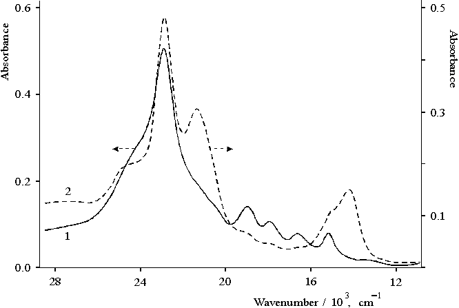 Fig. 7. Absorption spectra of porphyrin I in aqueous dioxane solution in the presence of 0.4 N hydrochloric acid, 1 (1 cm cell) and at higher initial concentration of porphyrin, 2 (0.2 cm cell). Hence, as a result of protonation reaction competing with the reaction of aggregation of porphyrin in aqueous-dioxane solution there are, at least, three forms of the dimers of porphyrin I interacting with protons, the electron spectra of which considerably differ each from other. Discussion According to the fluorescence spectra, the results show that the intermediate forms of the associates of porphyrin II in the excited state are likely to be the consequences of different mode of association of their molecules. Under the selective excitation of porphyrin II in the solution, the corresponding Raman spectra show, at least, two types of associates [12], which differ from each other by the character of intermolecular interactions (Fig. 6, curves 1 and 2). At the same time, the effect of water on the absorbance and luminescence properties of porphyrin II is found to be well-pronounced for thin films of this porphyrin. The presence of water traces in the film markedly changes the electron structure of the associated porphyrin as compared with that of water-free film (Fig. 1). The appearance of a new electron transition with the maximum at 750 nm was attributed to the formation of the donor-acceptor complex, in which proton donating water molecules are involved [25]. The Stokes shift of the emission of this form in the film is found to be very large and equal to 1500 cm1. Even though this new electron transition has lower-energy, as compared with the quasi-allowed Q-electron transition, no emission with the maximum at ~ 845 nm in the fluorescence spectrum of associated porphyrin II in DMF is observed. Only a high-energy emission in the 740800 nm region (shoulder) is seen but is still not identified. Hence, this evidence shows that the radiative deactivation of excitation of porphyrin II associated in thin film in the presence of water traces primarily proceeds via a new low-energy excited state rather than quasi-allowed electron transition. In contrast, the radiative deactivation of porphyrin II associated in the solution proceeds via the Qx electron transition. The energy of the excited state of the Qx(0,0) electron transition of porphyrin II associated in solution (Fig. 1) is equal to 1.83 eV. The energy gap between Qx(0,0) and 0,0-electron transition of the new low-energy excited state is 2150 cm1 (or 0.27 eV). The energy of the Qx(0,0) transition in the dimer of this porphyrin bound to copolymer I (Fig. 2A) is found to be somewhat higher than that of associated forms of porphyrin II (Figs. 1 and 2). For dimer and in the associated form of porphyrin II bound to copolymer II the energy is 1.89 eV and 1.84 eV, respectively. The Stokes shift of the emission in the monomer porphyrin I is equal to 240 cm1 but for the dimer of porphyrin II bound to copolymer I, this value is 370 cm1 (Fig. 2A). The Stokes shift in associated forms of porphyrin II is two times higher as compared with that in the dimer and is equal to 790 cm1 for porphyrin II in DMF (Fig. 1A) and to 760 cm1 for porphyrin bound to copolymer II (Fig. 2B). Hence, association of porphyrin II leads to a 1.5-fold increase in the Stokes shift for the dimer as compared with that in monomer porphyrin I and a higher (~ 3-fold) increase for the associated forms of porphyrin II. In contrast, the binding of porphyrin II with copolymer II has almost no effect on the Stokes shift as compared with the solution of this porphyrin. Macromolecular environment of porphyrin bound to hydrophobic-hydrophilic copolymer may assist the formation of intermolecular donor-acceptor complexes. The development of the donor-acceptor complex between p-benzoquinone and porphyrin in the presence of a weak acid in solution is observed only for monomer porphyrin [27]. In the case of dimers or associates of porphyrin, interaction of the both components in the complex should have far more complicated character as compared with monomeric porphyrin, or porphyrin dimer (or associates) may dissociate as a result of the formation of complex with the molecule of quinone. According to the differential excitation spectrum, the radiation center of the near IR emission is a singly protonated associate of porphyrin II bound to copolymer II [12]. Hence, in the associate a strong interaction of porphyrin with carboxyl group of copolymer takes place. Similar character of the fluorescence spectrum in the near IR region (Fig. 3, curve 4) and the fluorescence spectrum of dimeric porphyrin with the maximum at 1000 nm [15] allows one to suggest that the associated (or dimeric) porphyrin interacting with proton also is a radiative center in the presence of quinone in the solution. Hence, the donor-acceptor complex produced between the associated porphyrin molecules is preserved under the interaction with quinone. Furthermore, as evidenced by an increase of the near IR emission when concentration of quinone is below 60 mM, quinone is involved in the complex with the associated porphyrin. Although, the near IR emission is strongly quenched by the quinone above 60 mM. The EPR spectrum of porphyrin II associated in DMF suggests the dissociation of intermolecular complex under illumination with visible light to radicals cation and anion (Fig. 4, the inset). Note that violet-blue illumination leads to a marked decrease of the EPR signal (Fig. 5, the inset), i.e the quantum yield of the radicals decreases. These results correlate well with the data for the accumulation of porphyrin II di-cation as revealed by the absorption spectroscopy under steady-state illumination at 298 K (table). The above results may be explaned as follows. The dimer or associate of porphyrin in the excited state is protonated at one of the pyrrole atoms of the tertiary nitrogen. Such restrictive protonation may lead to intracomplex 