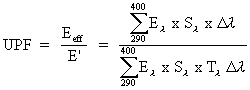 The measurements of the UV-transmittance through clothing were consistent with the method described in the Standard Australia publication (Standard Australia 1996). A spectroradiometer fitted with an integrating sphere was used for the measurement. Fabric samples were glued to metal rings and placed in direct contact with the aperture of the spectroradiometer. The spectral transmittance, Tl , which is the ratio of the transmitted irradiance to the source irradiance at the wavelength l was determined. For assessing the protection of clothing, the concept of the ultraviolet protection factor (UPF) is used. It is defined by the following equation